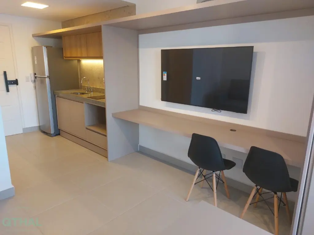 Studio totalmente mobiliado e pronto para morar, com excelente ventilação e iluminação natural, Ar-condicionado instalado, Sala equipada com Sofá 2 lugares, Bancada com 2 cadeiras e TV 55.