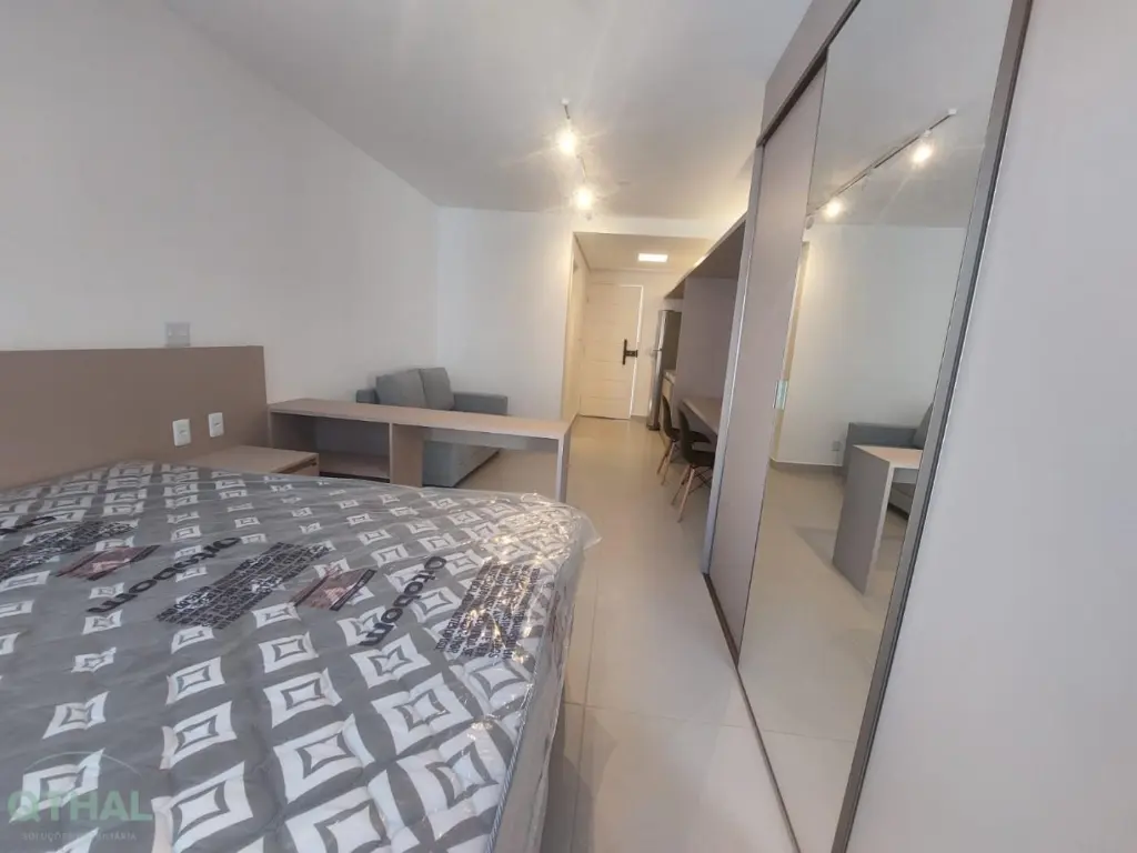 Studio totalmente mobiliado e pronto para morar, com excelente ventilação e iluminação natural, Ar-condicionado instalado, Sala equipada com Sofá 2 lugares, Bancada com 2 cadeiras e TV 55.