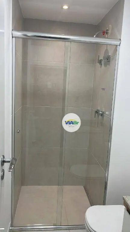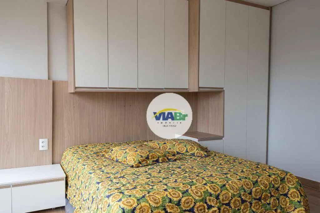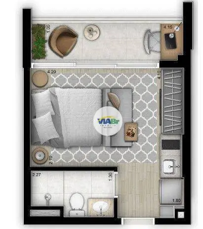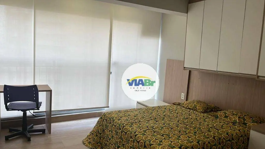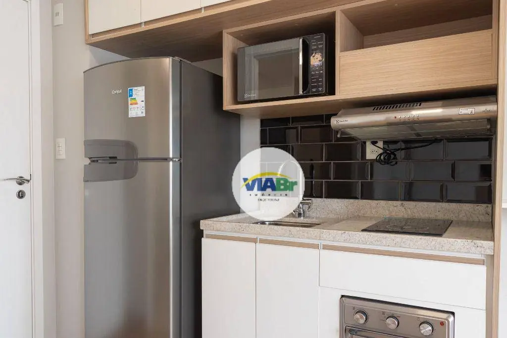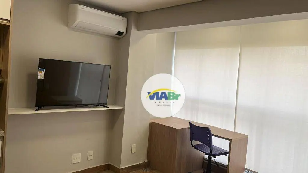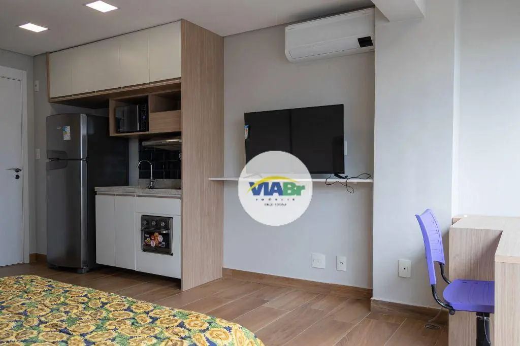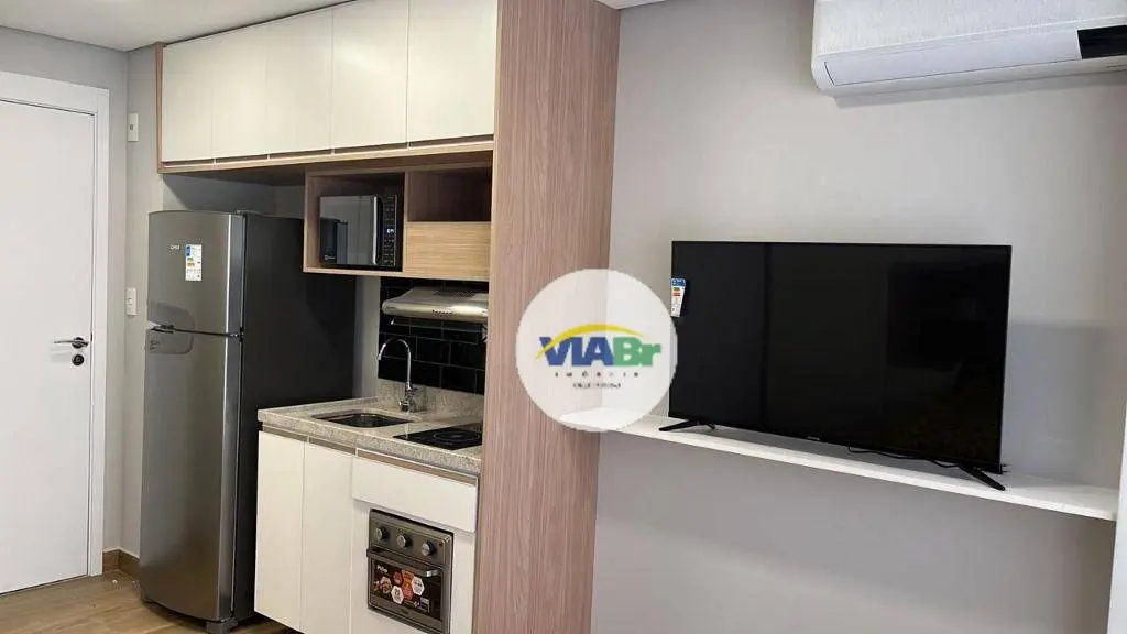 Com 25 m², o apartamento possui armários, ar condicionado e ambientes integrados, incluindo living/dormitório, sacada integrada, cozinha equipada e banheiro social.