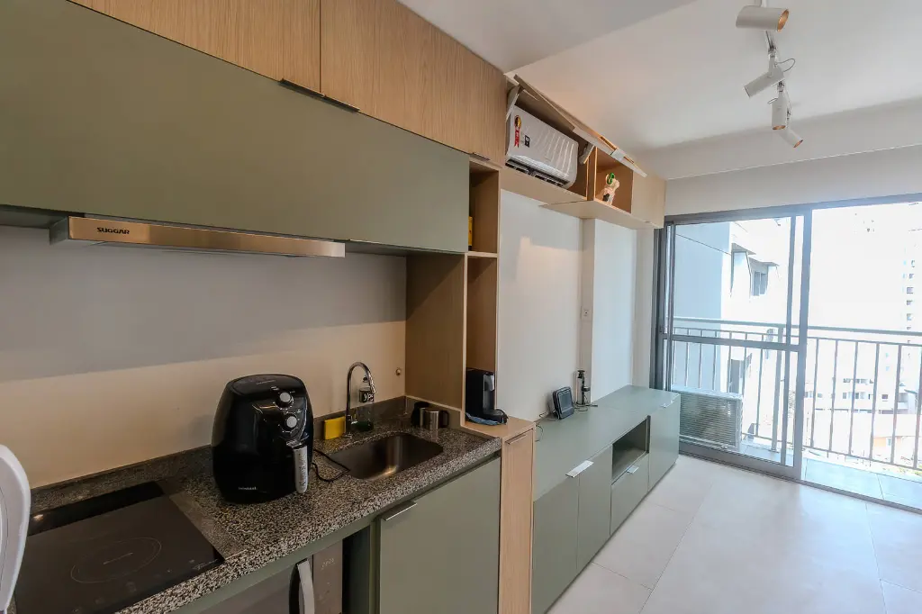 Cozinha Funcional: Inclui cooktop, geladeira com freezer e micro-ondas, prontos para uso.