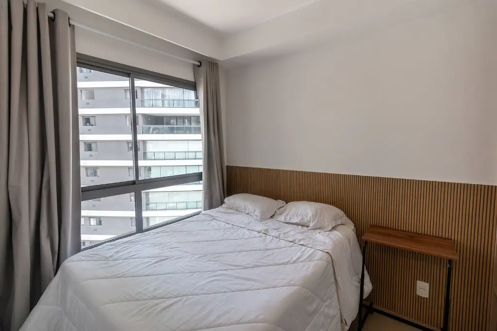 Apresentamos um moderno studio de 27m², localizado na Avenida Santo Amaro, 1.342, estrategicamente situado entre os bairros Itaim Bibi, Vila Olímpia e Vila Nova Conceição. Este espaço foi inteligentemente projetado para oferecer conforto e praticidade, contando com um dormitório separado e armários planejados que maximizam o uso do espaço.