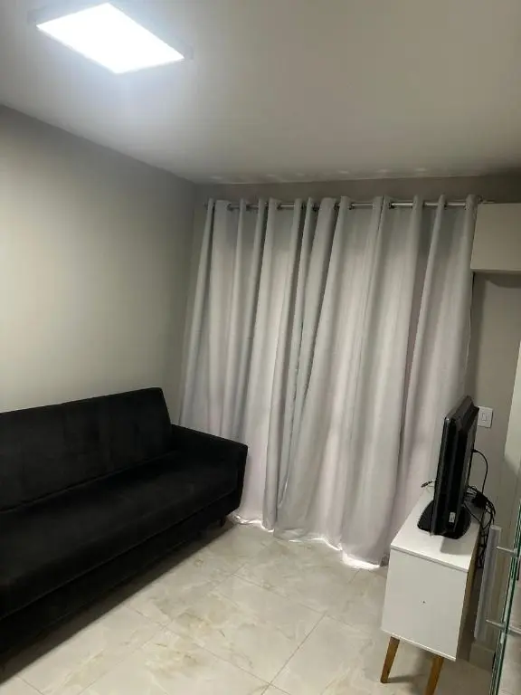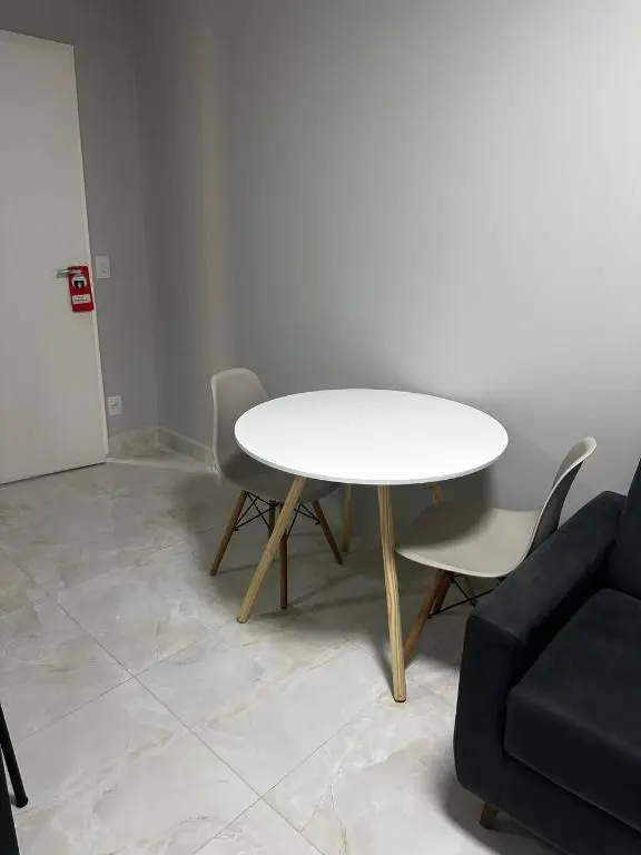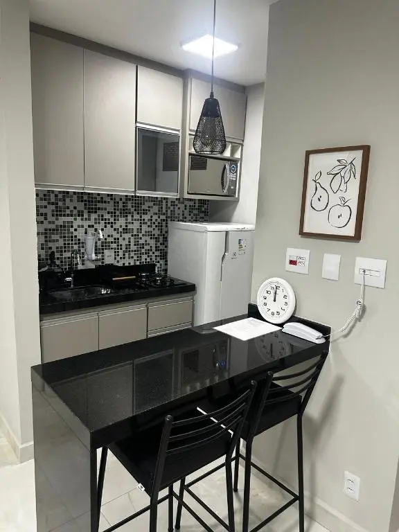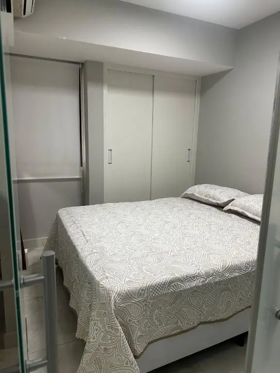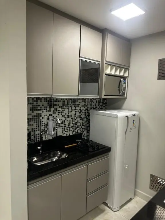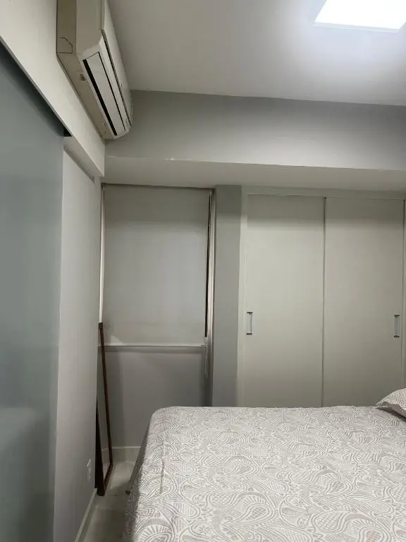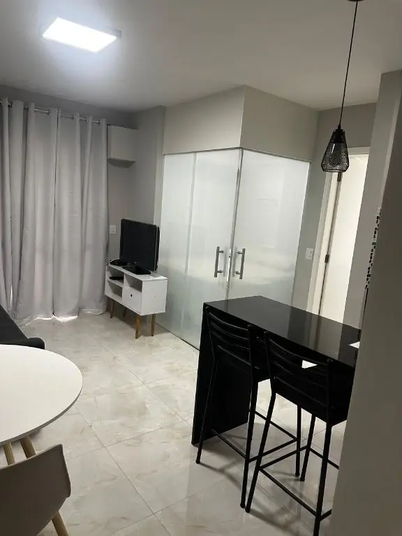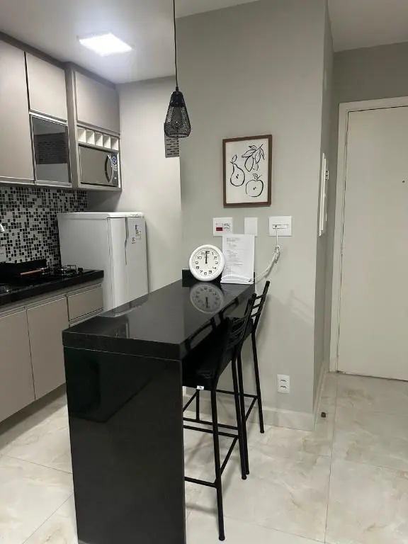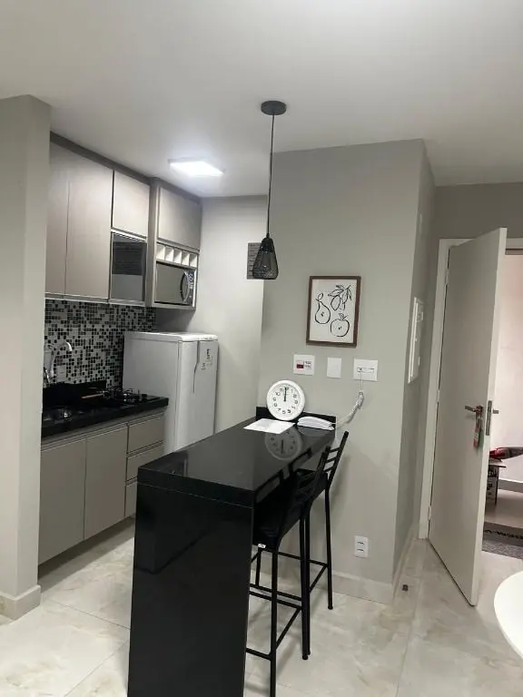 1 dormitório confortável com cama box, armário, mesa de cabeceira e ar condicionado, 1 banheiro moderno, com pia em mármore Travertino branco, box de vidro, cozinha com armários planejados, geladeira, cooktop, micro ondas, balcão de mármore com banquetas, sala de estar e jantar, com sofá, rack com TV, mesa com cadeiras, lavanderia com armário planejado e máquina de lavar e 1 vaga de garagem.
