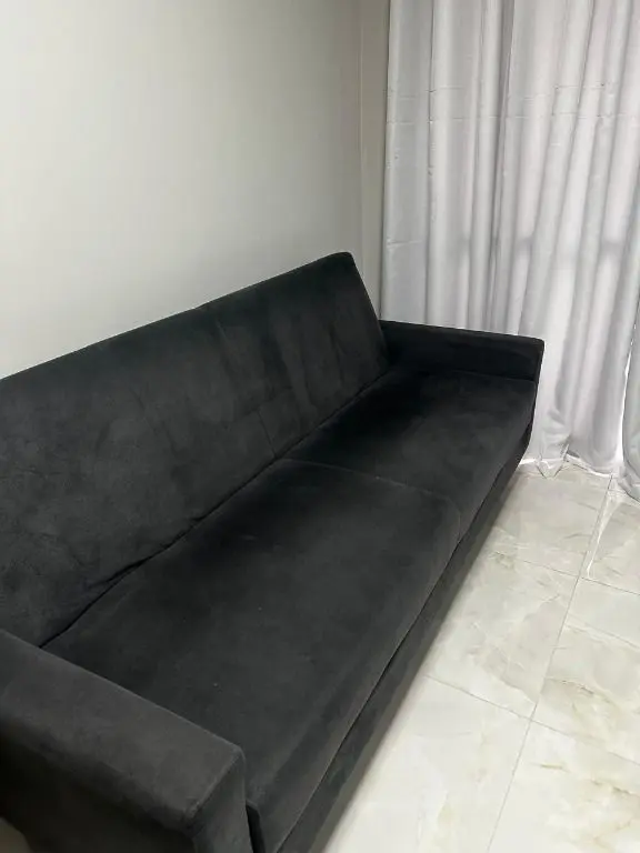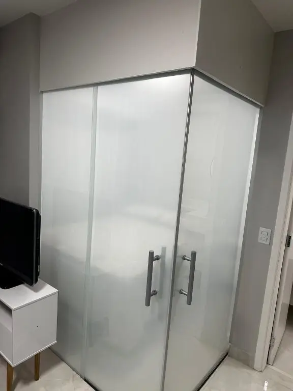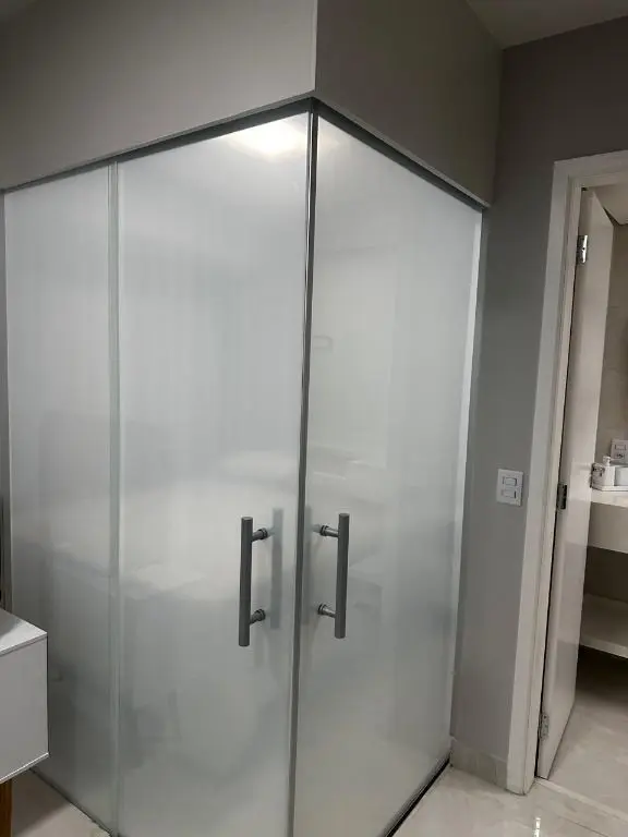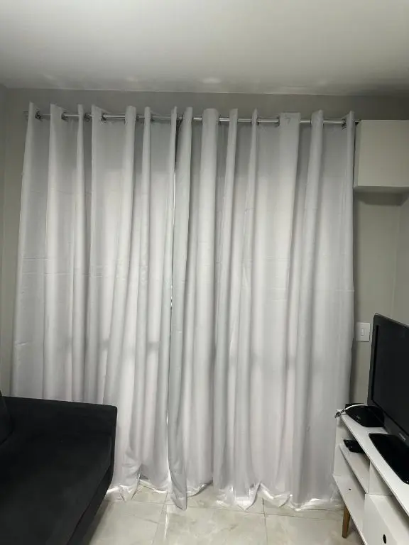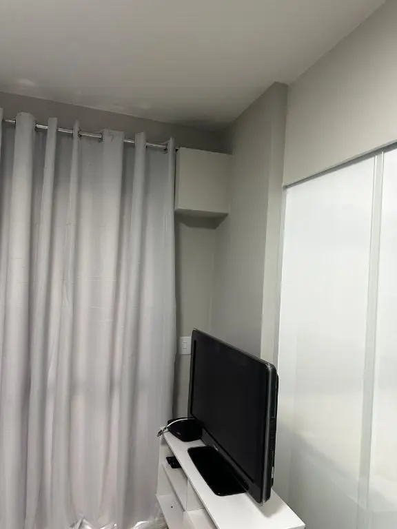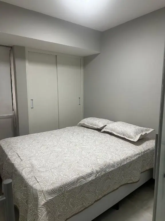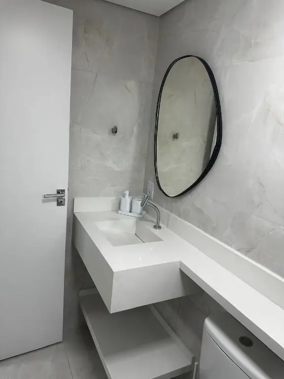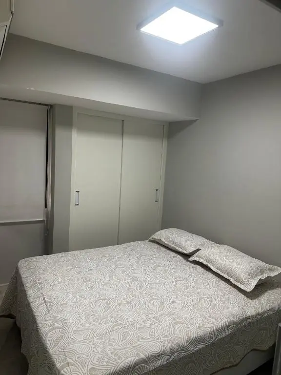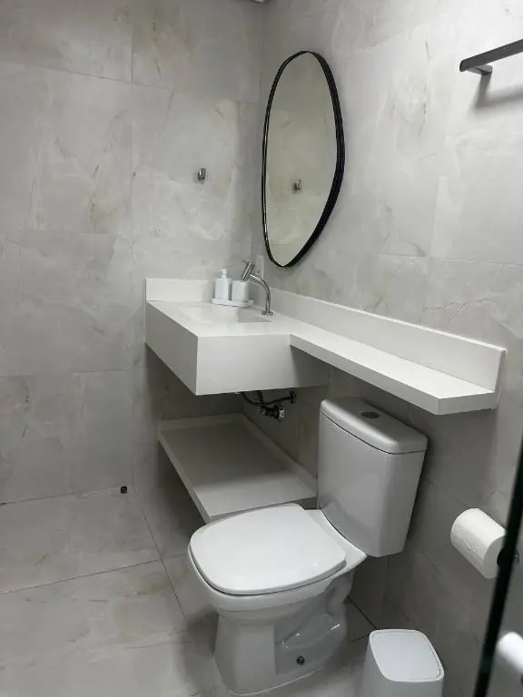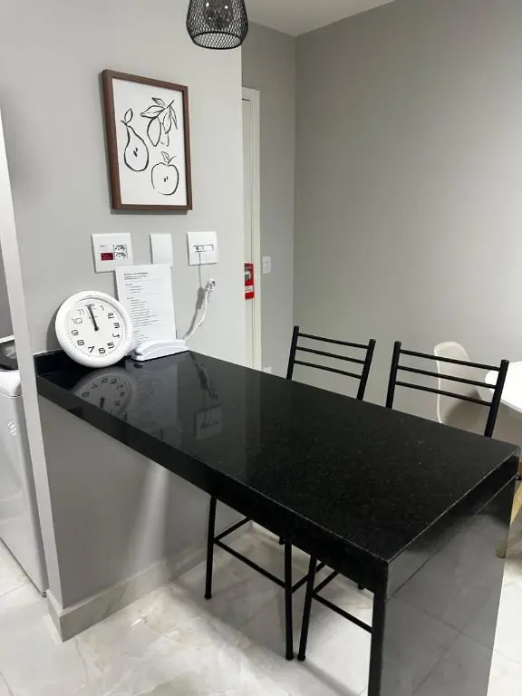 1 dormitório confortável com cama box, armário, mesa de cabeceira e ar condicionado, 1 banheiro moderno, com pia em mármore Travertino branco, box de vidro, cozinha com armários planejados, geladeira, cooktop, micro ondas, balcão de mármore com banquetas, sala de estar e jantar, com sofá, rack com TV, mesa com cadeiras, lavanderia com armário planejado e máquina de lavar e 1 vaga de garagem.