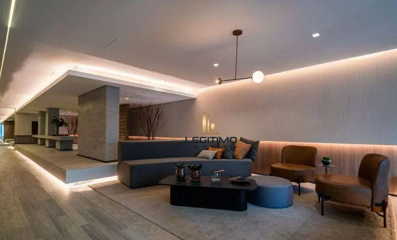Studio totalmente mobiliado para alugar com armários planejados, cozinha equipada, ambiente moderno e bem iluminado.