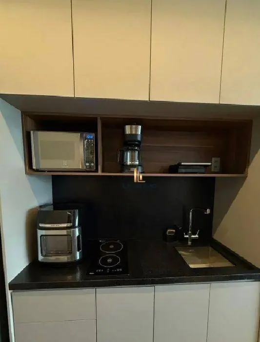 Studio totalmente mobiliado para alugar com armários planejados, cozinha equipada, ambiente moderno e bem iluminado.