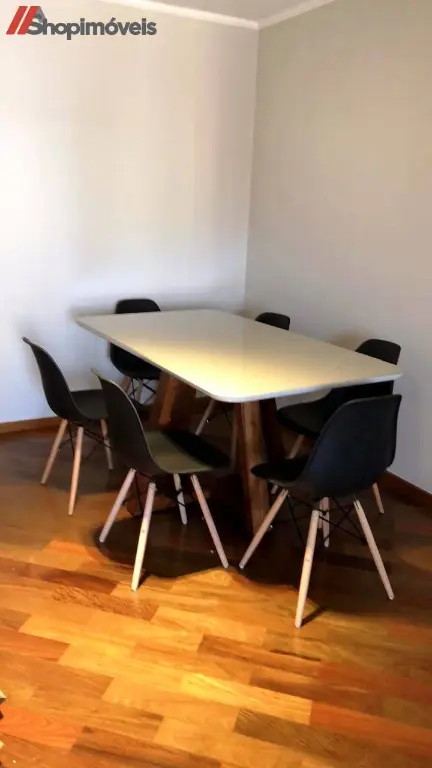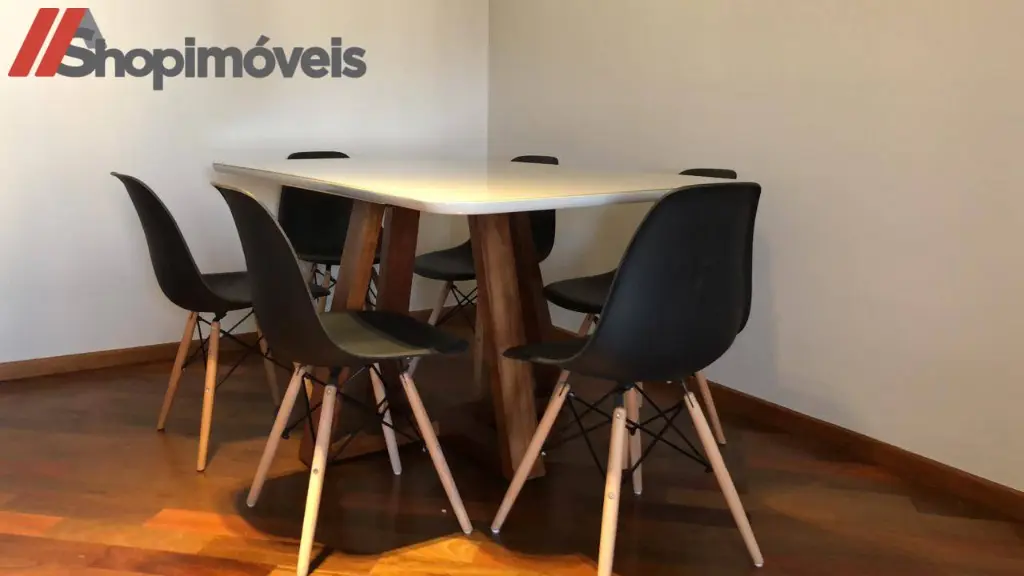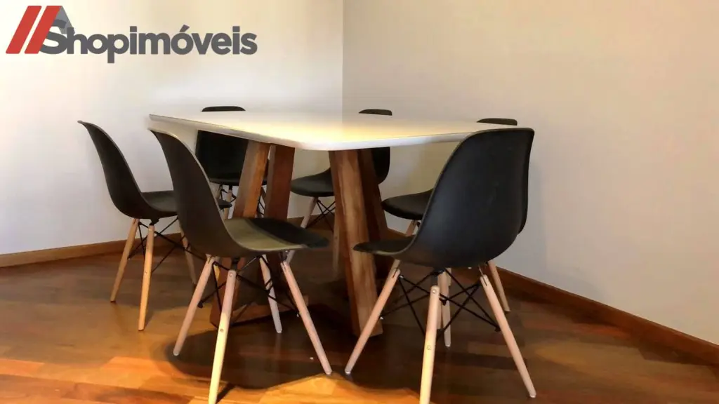 A sala de jantar é integrada, com mesa para seis lugares, proporcionando um ambiente moderno e aconchegante.