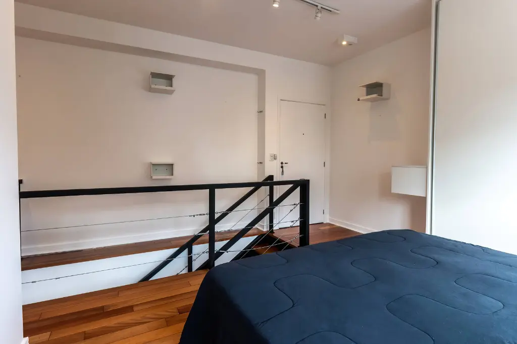 Apartamento duplex mobiliado. O pavimento inferior tem uma sala para 2 ambientes com amplas janelas