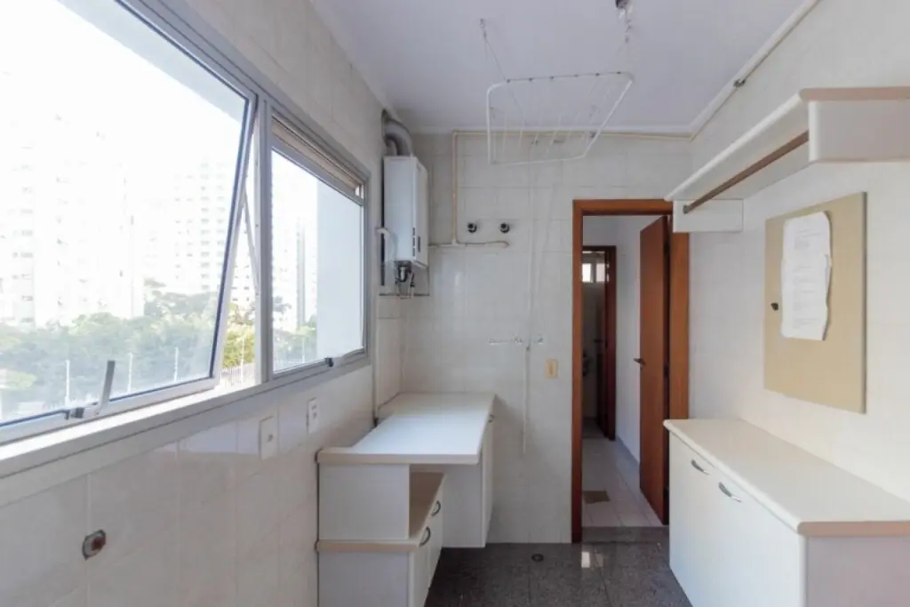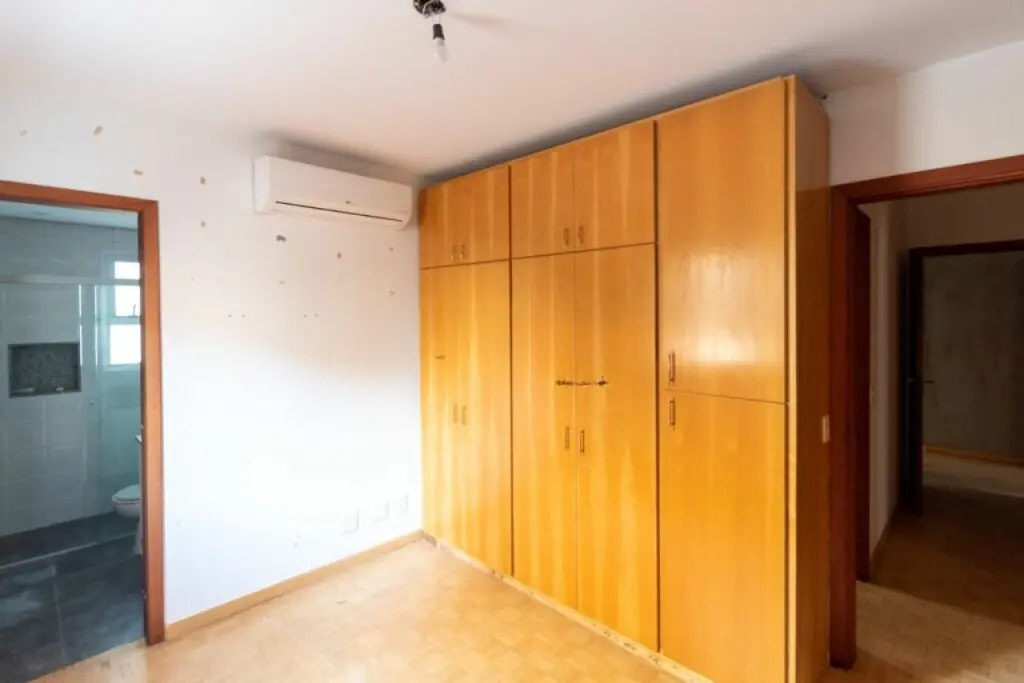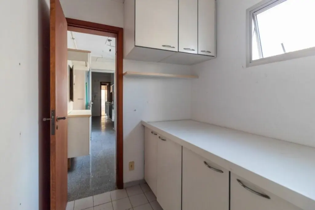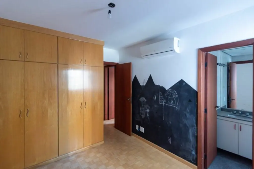 Amplo apartamento com 143m2, e 2 vagas de garagem. Com 3 suítes todas com ar condicionado e armários, sala de estar também com ar condicionado e varanda, lavabo, cozinha com armários e fogão embutido, dependências de empregados e área de serviço.
