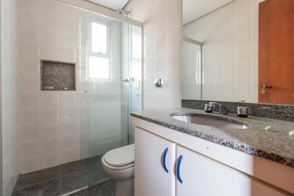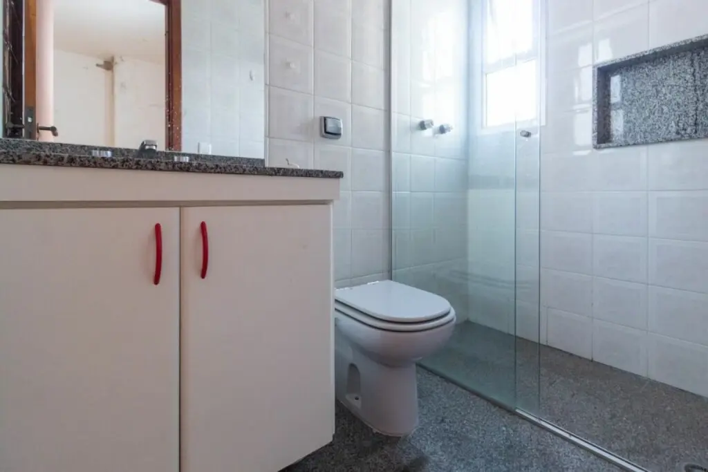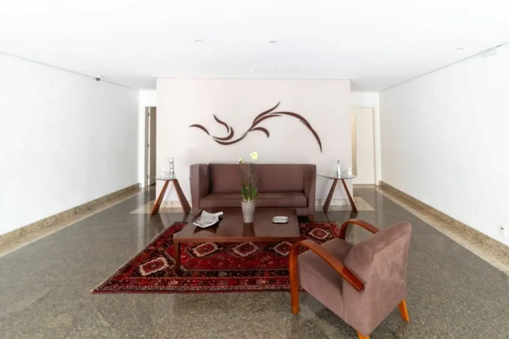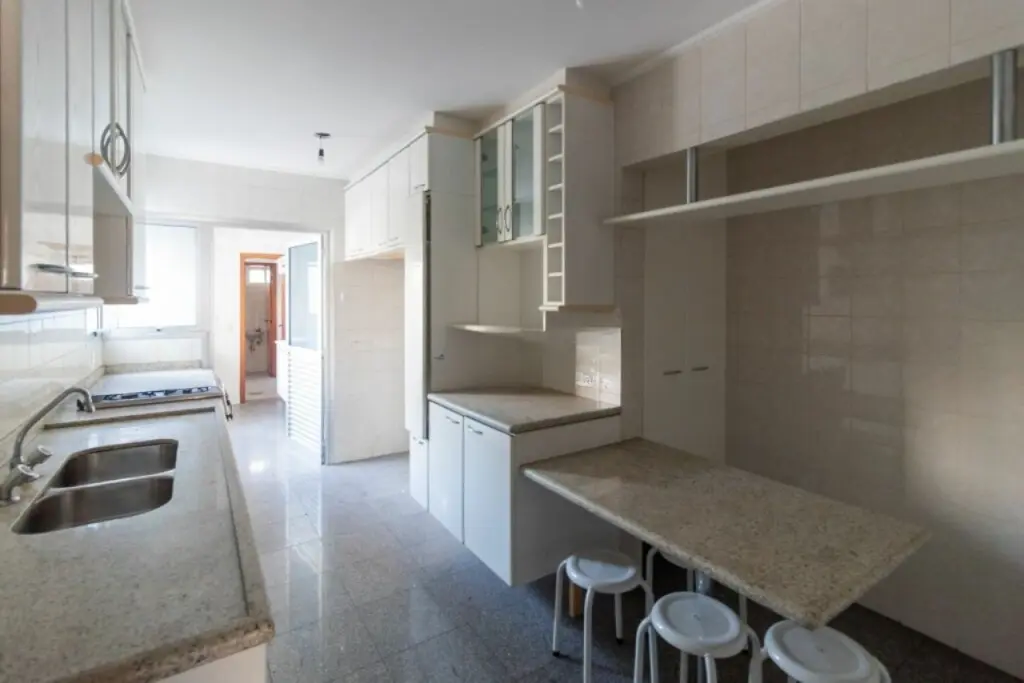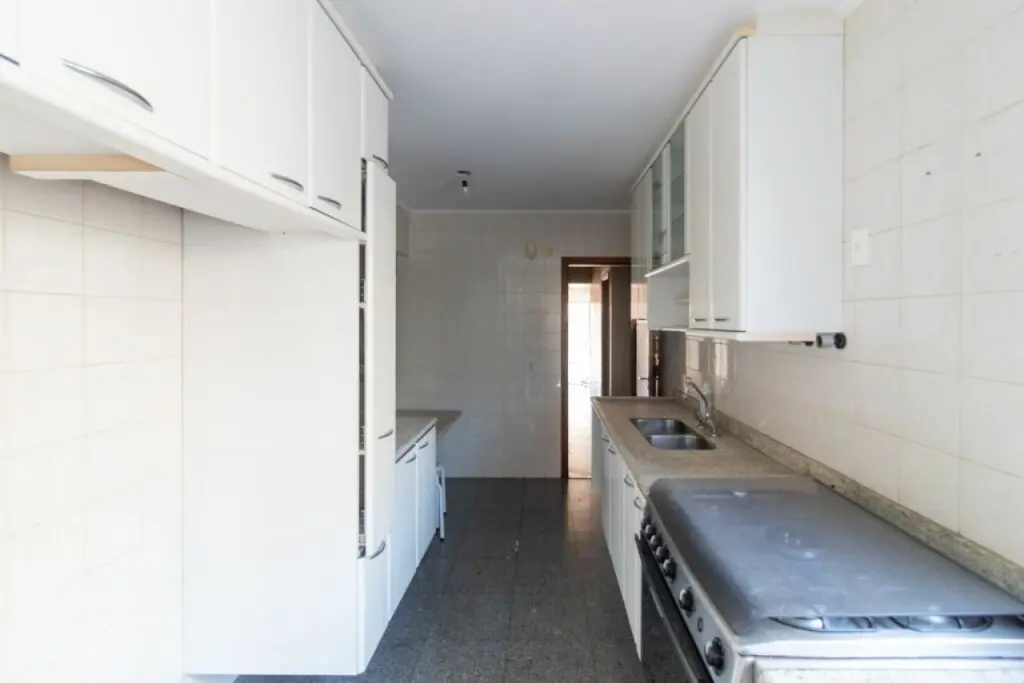 Amplo apartamento com 143m2, e 2 vagas de garagem. Com 3 suítes todas com ar condicionado e armários, sala de estar também com ar condicionado e varanda, lavabo, cozinha com armários e fogão embutido, dependências de empregados e área de serviço.