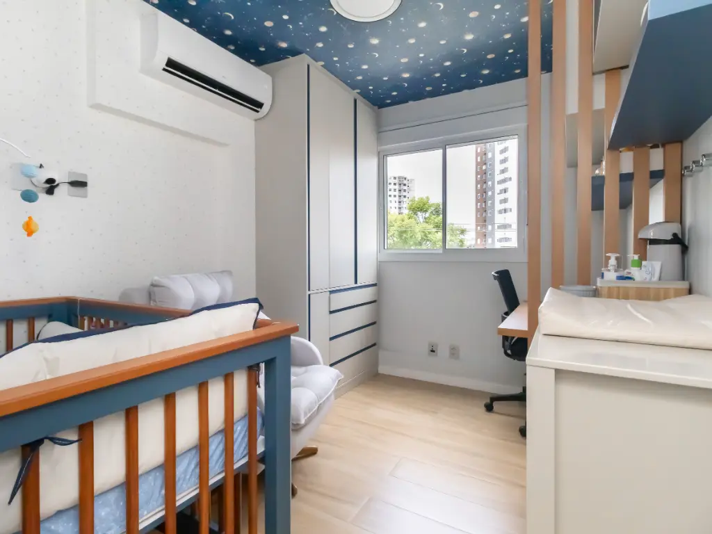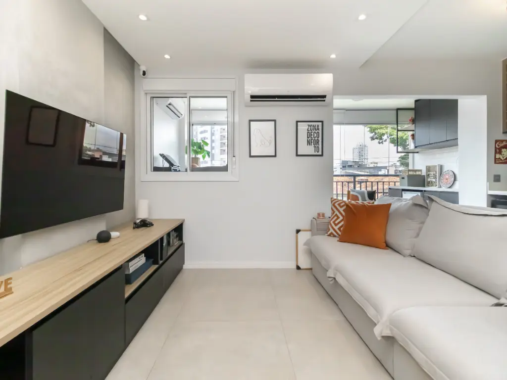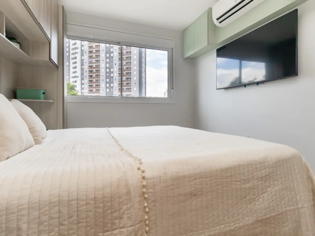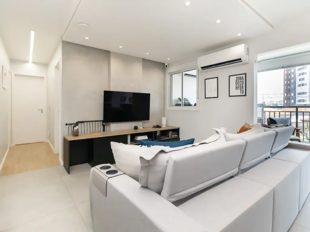 O apartamento já possui quatro pontos de ar-condicionado instalados, e a condensadora ainda comporta mais um ponto adicional, permitindo futuras ampliações com facilidade.