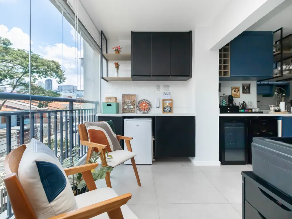 A varanda envidraçada amplia a entrada de luz natural e a sensação de liberdade, proporcionando momentos de contemplação e relaxamento em qualquer clima.