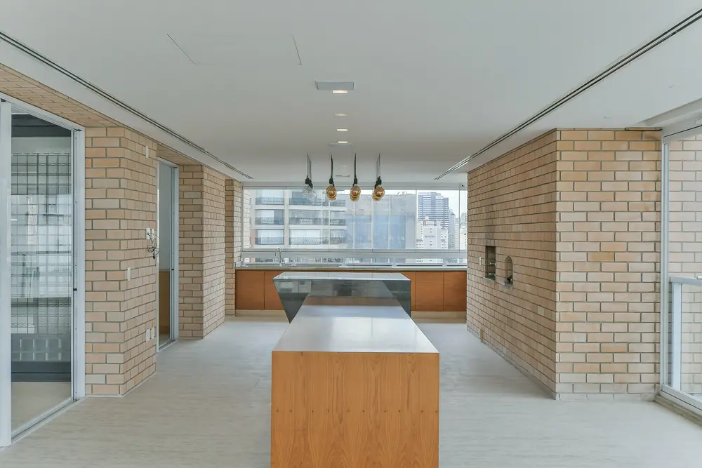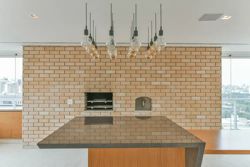 O living espaçoso se conecta à varanda gourmet em L, criando o cenário ideal para receber amigos ou curtir momentos especiais em família. Equipado com churrasqueira, forno de pizza e uma adega climatizada para até 360 garrafas, esse ambiente é um verdadeiro convite para viver bem, tudo isso com a moldura verde do parque ao fundo.