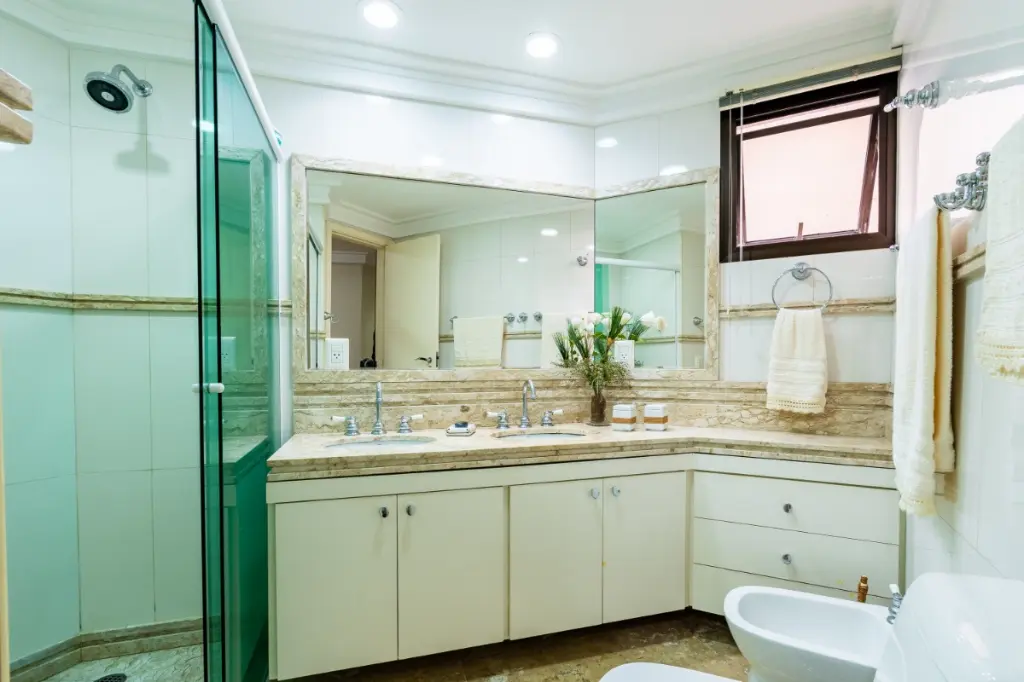 - Banheiros: Todos com mármore travertino