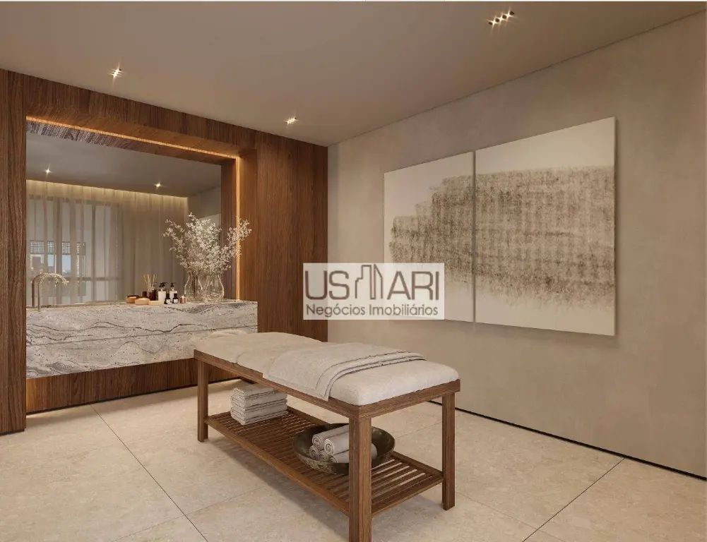 A suíte master e a cozinha são entregues com duas cubas, reforçando o padrão elevado de acabamento.