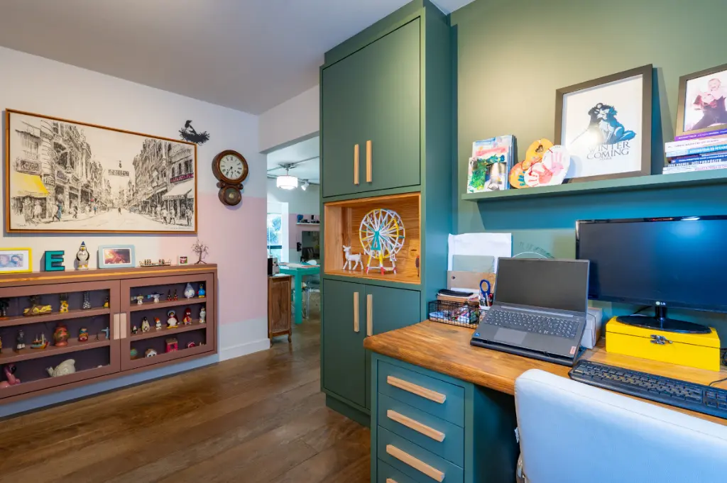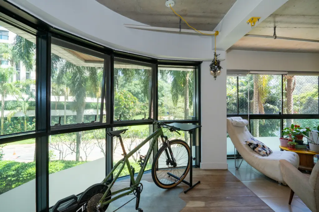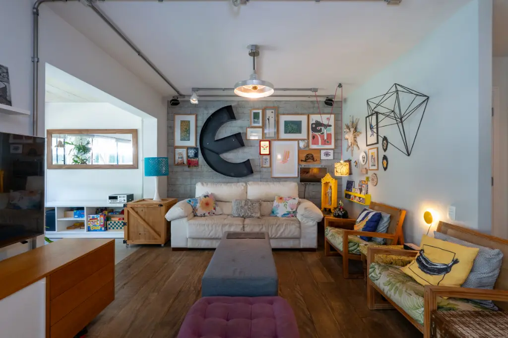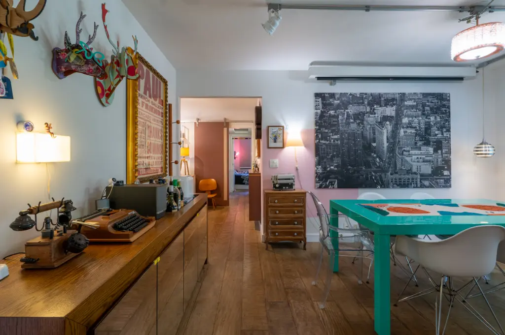 Um dos grandes protagonistas é o piso de madeira de demolição presente em todo o apartamento, que imprime personalidade, aconchego e sofisticação em cada ambiente.