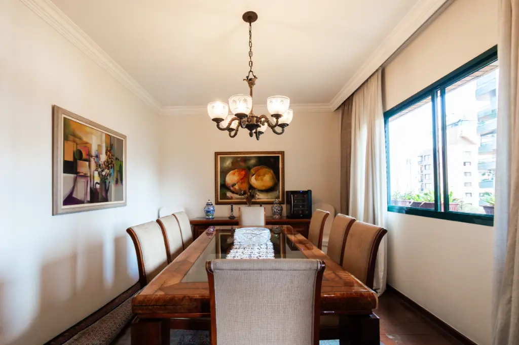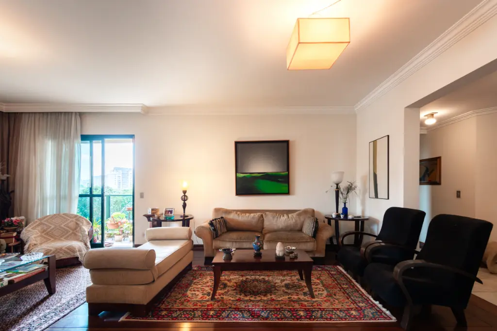 O projeto valoriza a amplitude e a iluminação natural. São 4 suítes espaçosas, sendo a máster um verdadeiro refúgio com closet e hidromassagem. O living imponente comporta confortavelmente três ambientes e se integra a uma varanda charmosa com vista para a copa das árvores. A infraestrutura é completa: copa-cozinha planejada, área de serviço isolada, 3 vagas de garagem cobertas e um depósito privativo generoso no subsolo.