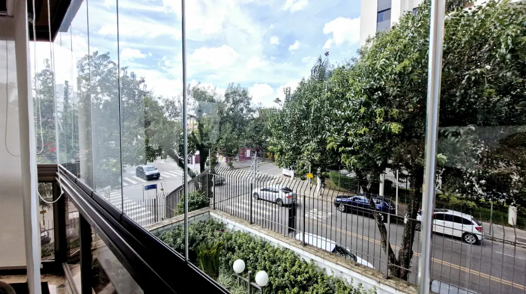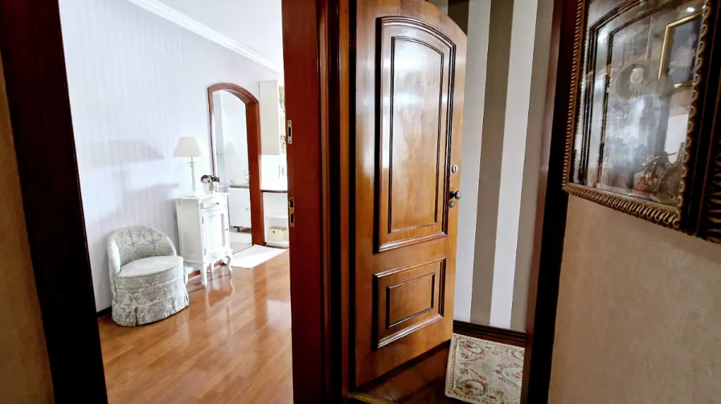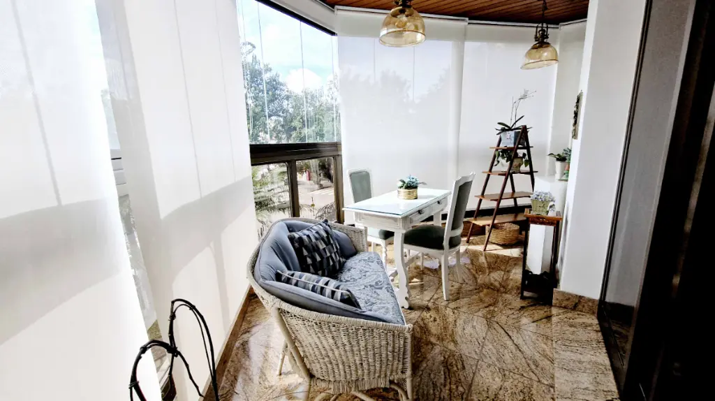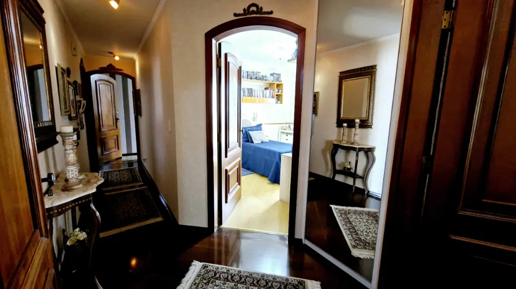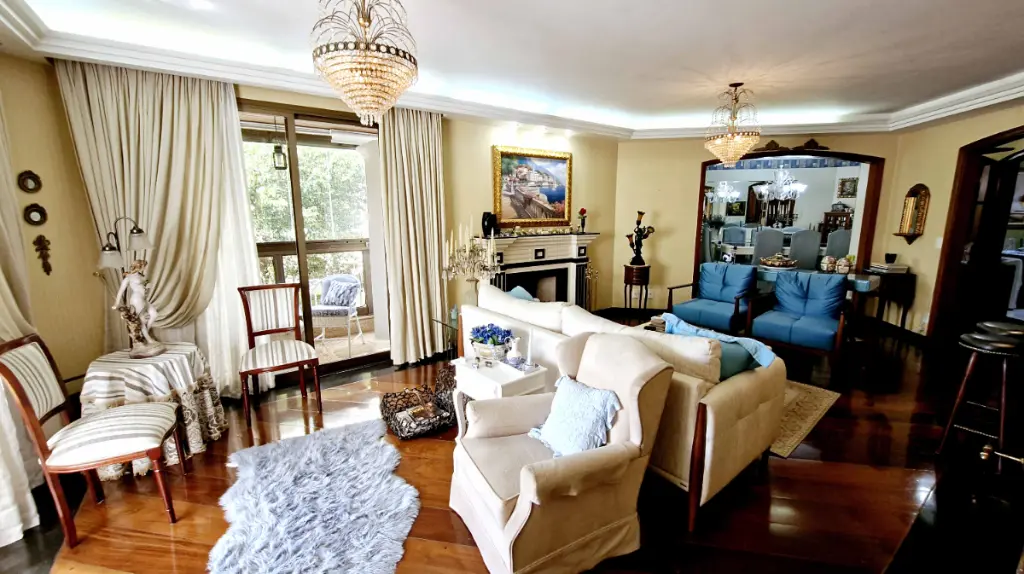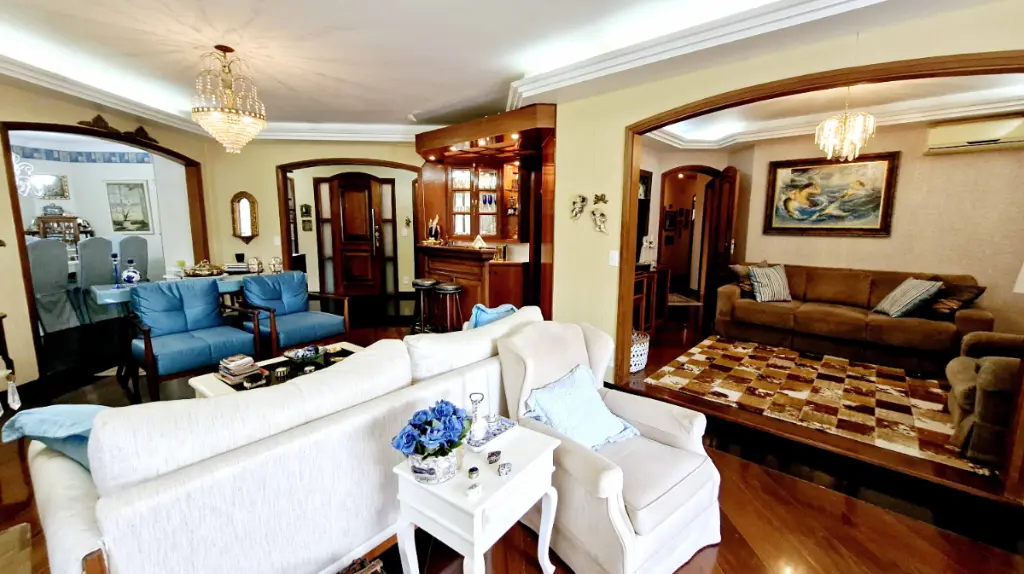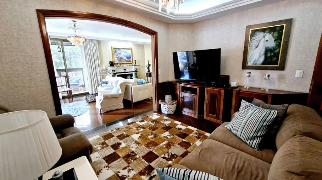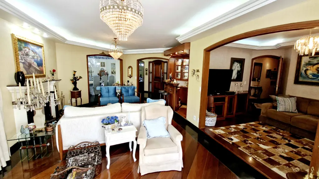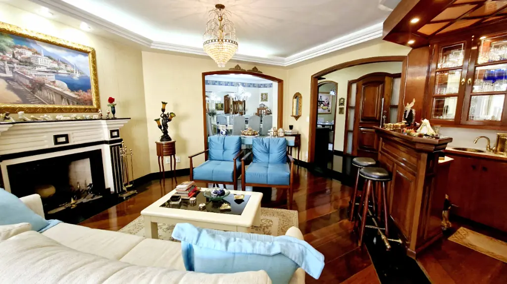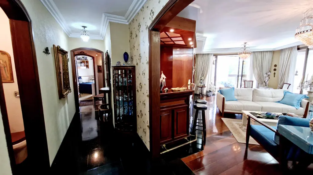 Ao entrar, você é recepcionado por um hall elegante, que conduz à ampla sala de estar com lareira em mármore, detalhes em madeira de lei e varanda com vista livre perfeita para momentos de relaxamento. O Apartamento pois 6 sacadas ( sendo 2 varandas e 4 varandas para cada quarto ). Sala de Tv, sala de estar com lareira que acompanha um bar com adega, sala de almoço e sala de jantar mais intimista, além de uma sala de leitura, com estante para livros; um verdadeiro refúgio dentro de casa.
