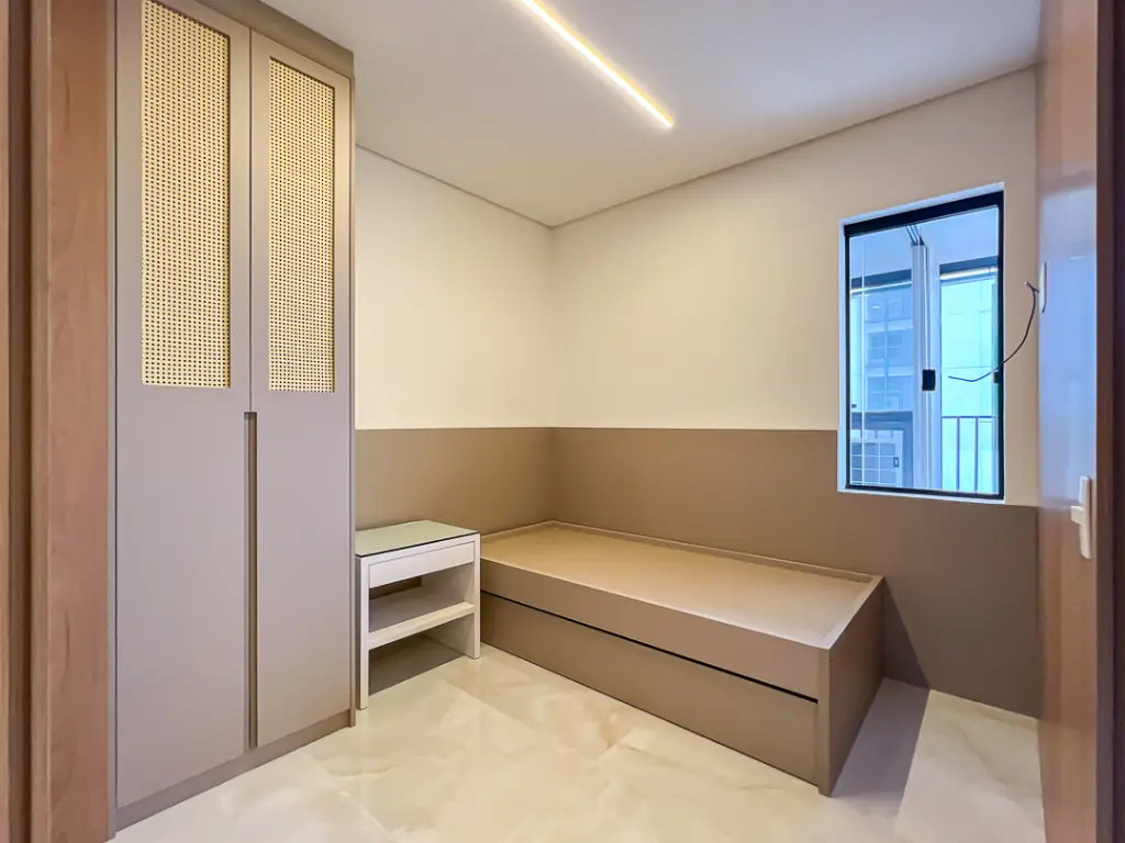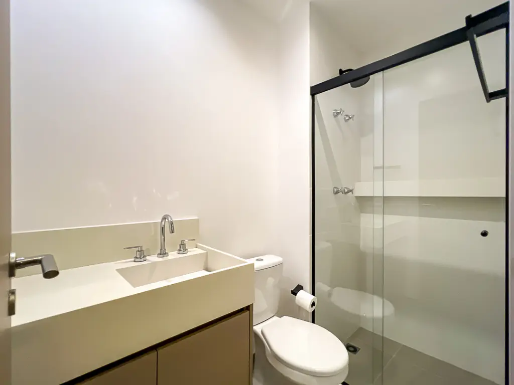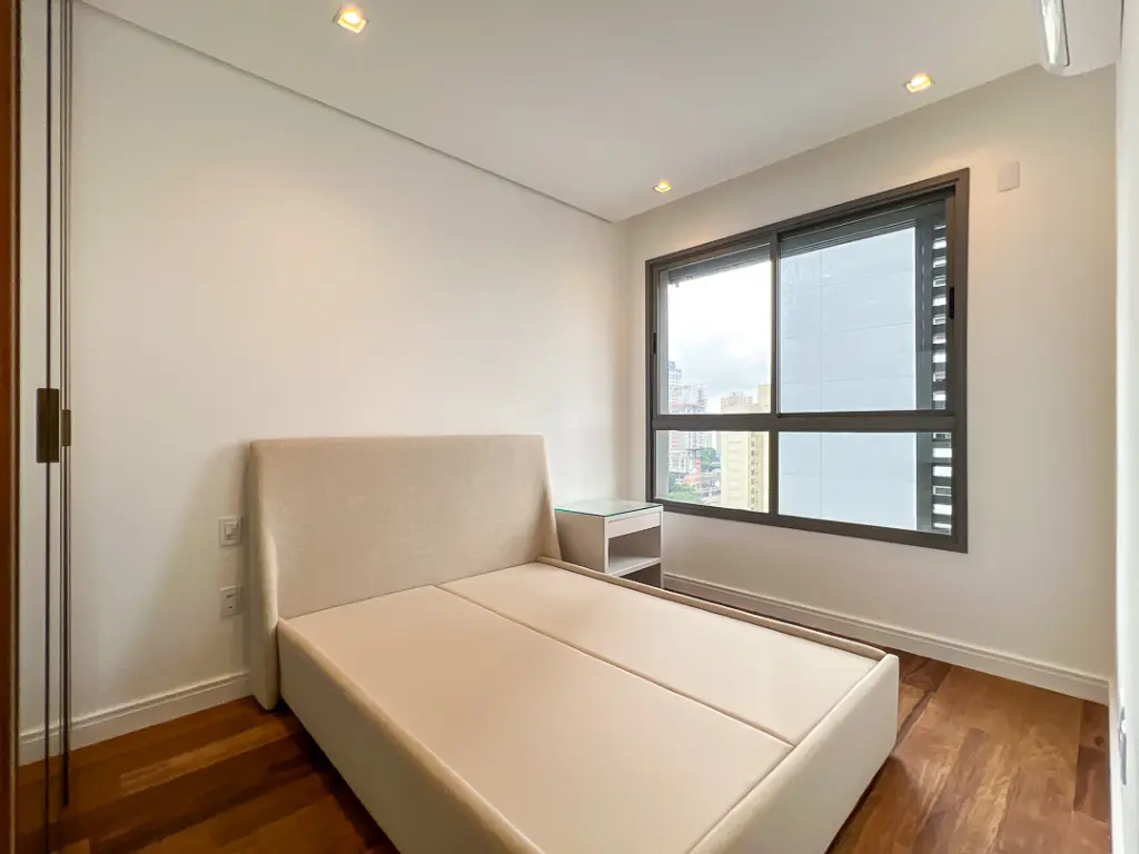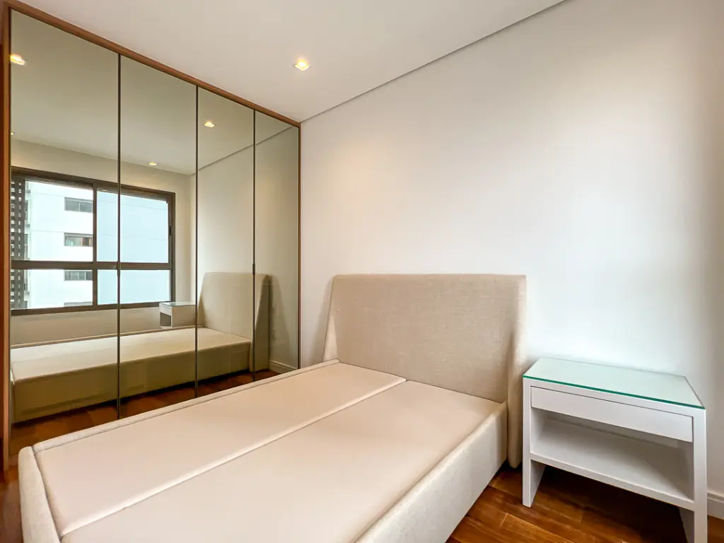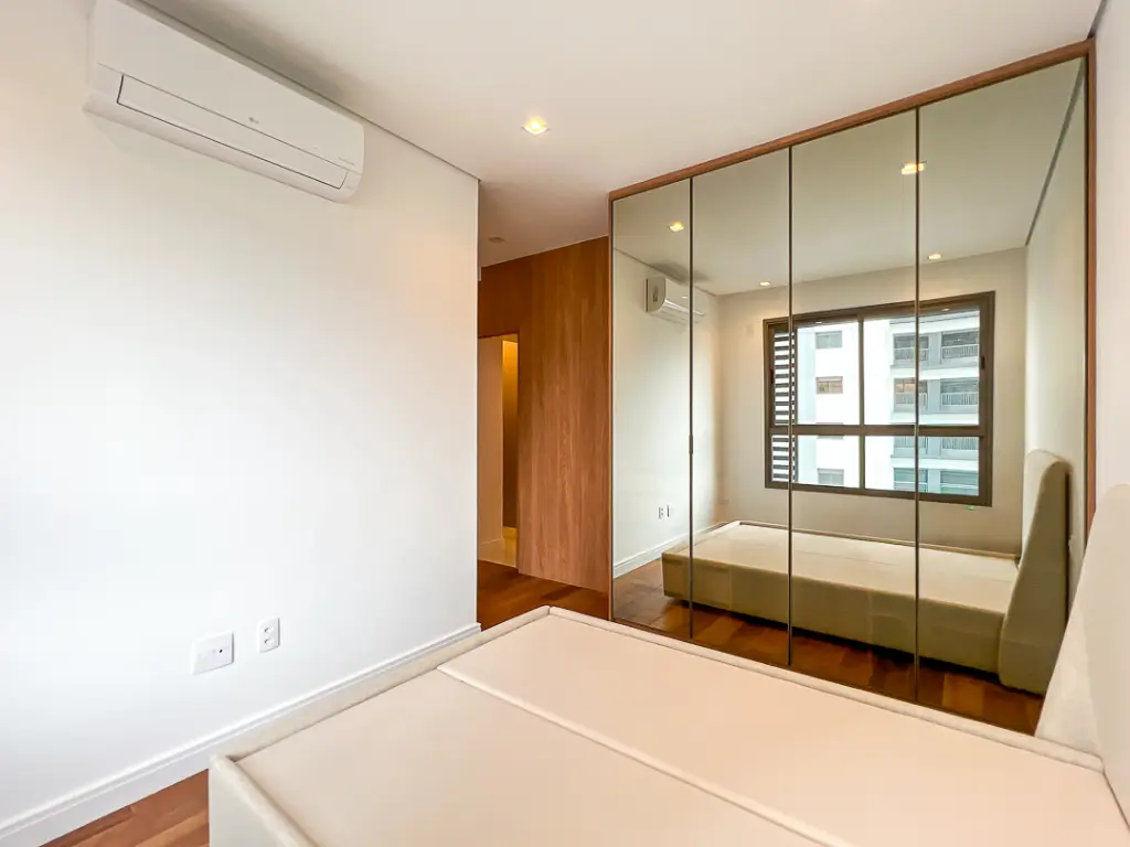 Na área íntima, o apartamento possui dois dormitórios, sendo uma suíte, além de banheiro social que atende ao segundo quarto e às visitas. Dispõe também de área de serviço bem ventilada e 1 vaga de garagem. Todos os ambientes contam com armários planejados e ar-condicionado, garantindo conforto e praticidade.