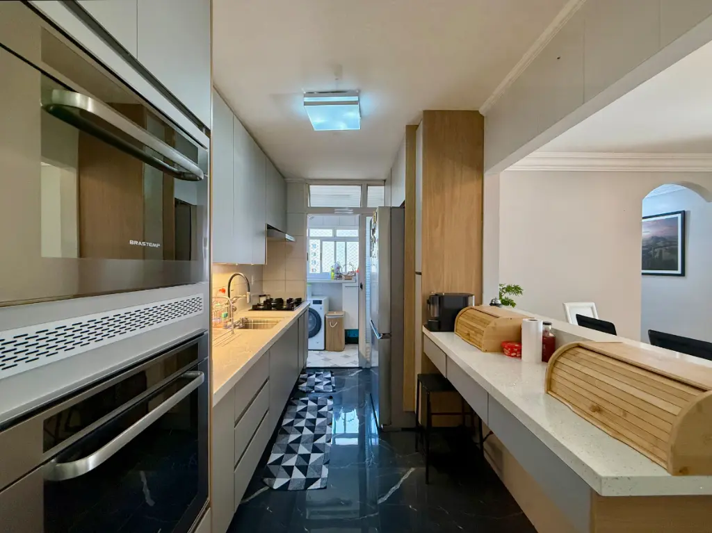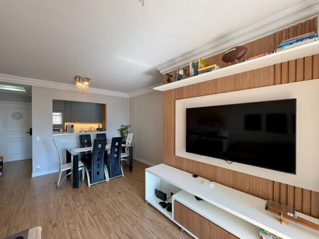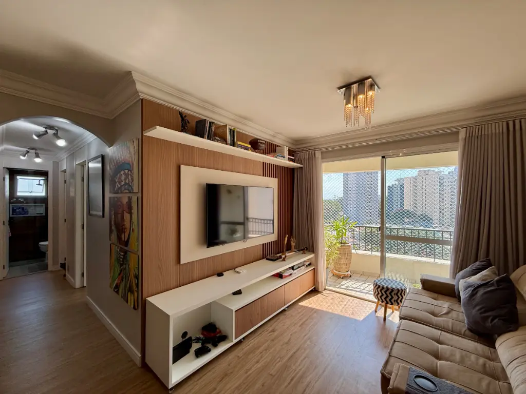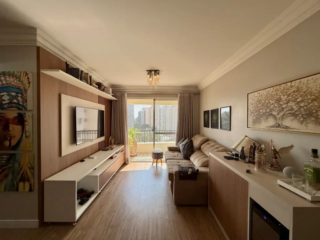 Localizado em andar alto, o apartamento apresenta uma vista encantadora para a cidade e possui sacada, ideal para momentos de relaxamento. O interior conta ainda com móveis planejados e piso laminado, conferindo um toque de modernidade e sofisticação. A cozinha no modelo americana complementa o estilo do ambiente. Toda parte elétrica foi modernizada e os interruptores possuem conexão com a Alexa e a porta possui fechadura eletrônica, trazendo assim mais facilidade para o seu dia a dia.