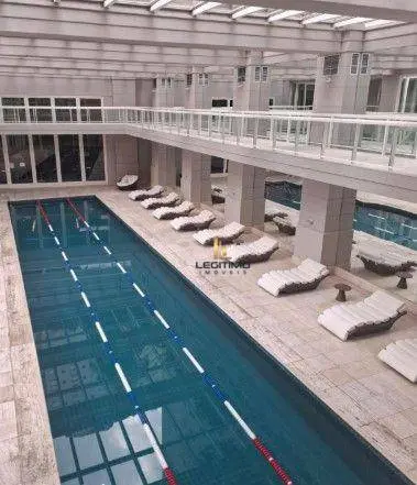 Lazer completo com piscina, sauna, quadra poliesportiva e churrasqueira.