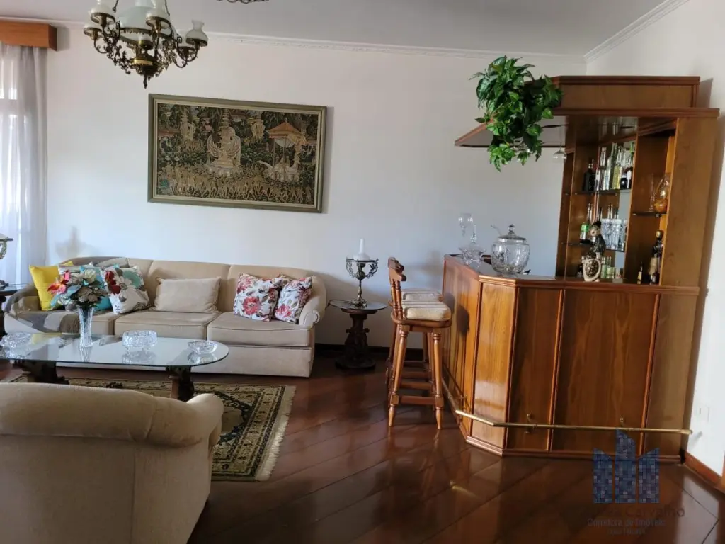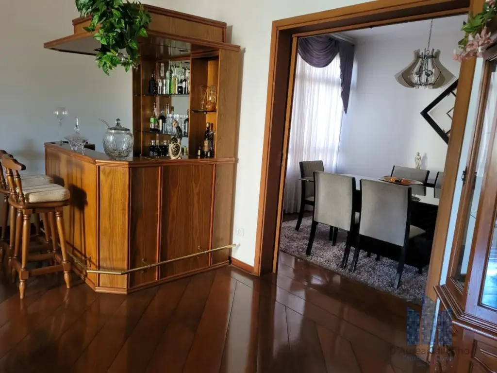 Apartamento mobiliado com boa ventilação e luminosidade. Possui: 4 dormitórios, sendo 4 suítes, 5 banheiros, sendo 1 lavabo, living amplo para dois ambientes, varanda, cozinha com armários embutidos e área de serviço com dependência de empregada. Vaga de garagem para 4 veículos.