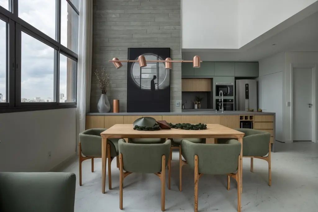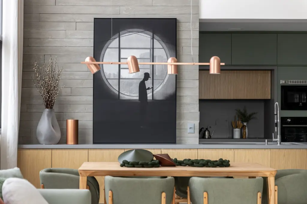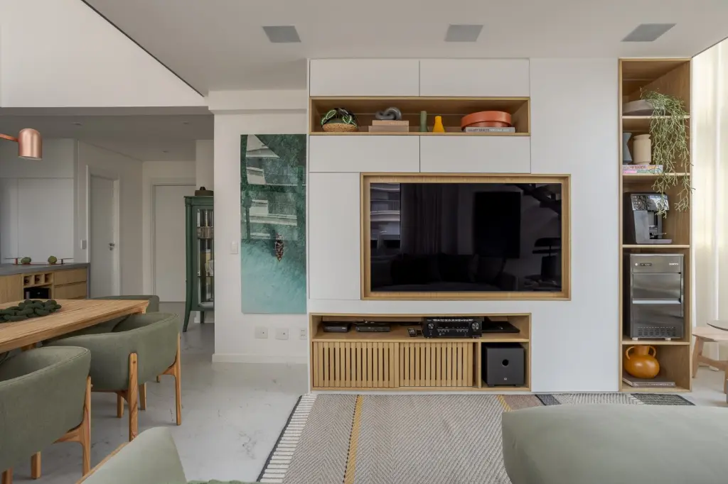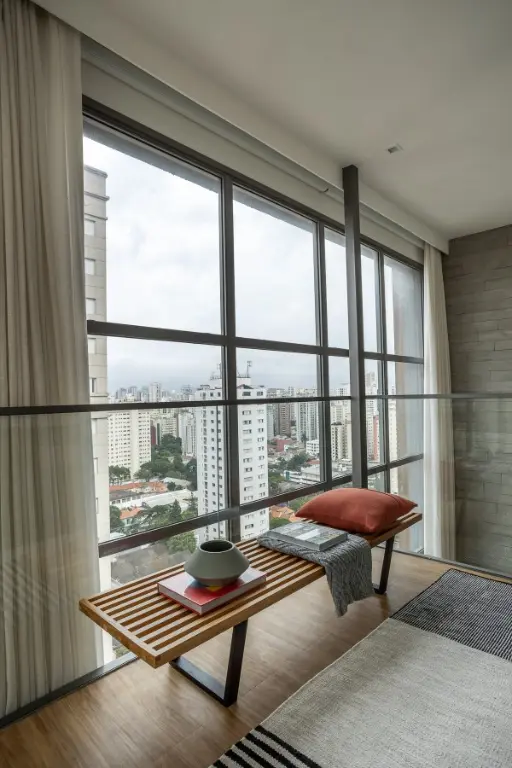O living possui pé-direito de aproximadamente 5,5 m e parede arquitetônica em ripas cimentícias, marcenaria em carvalho americano e mobiliário assinado que permanece no imóvel: sofá Fernando Jaeger, poltrona Estúdio Bola, mesa e cadeiras Lider, tapetes Fernando Jaeger e iluminação Lumini. Automação completa de iluminação, cortinas e persianas em linho.