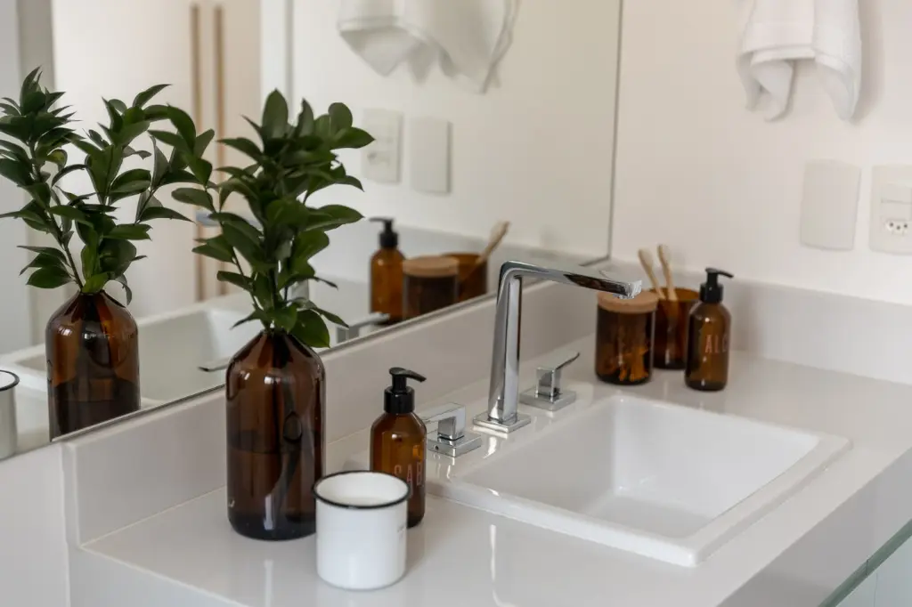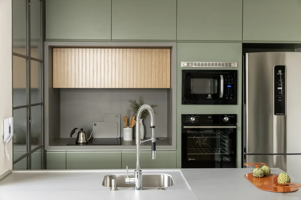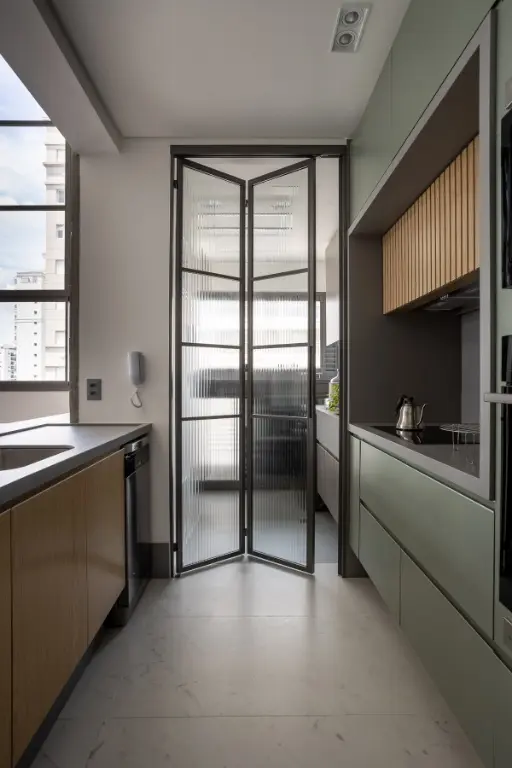 Sistema de aspiração central instalado na personalização da construtora. Área de serviço completa com bancada Dekton, marcenaria e fechamento em serralheria com vidro canelado.