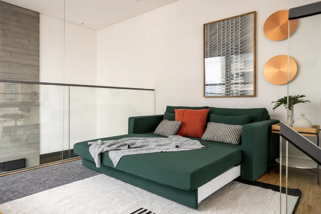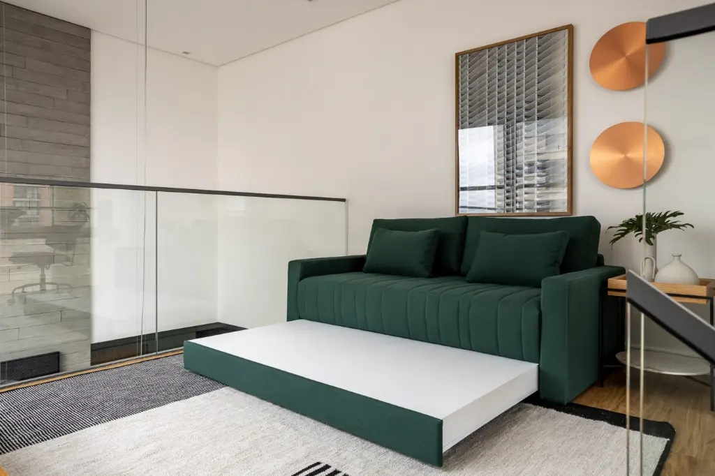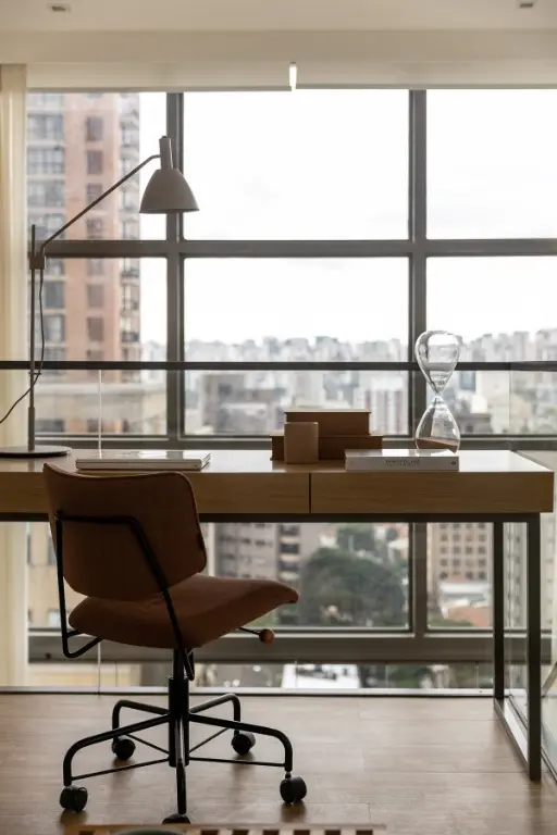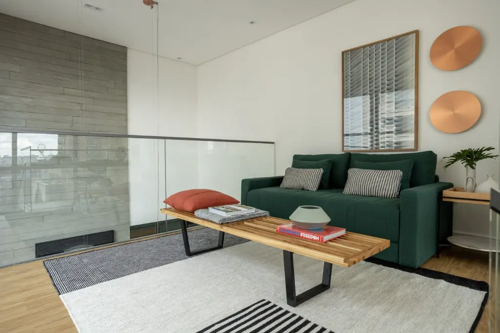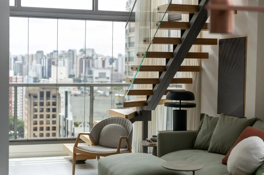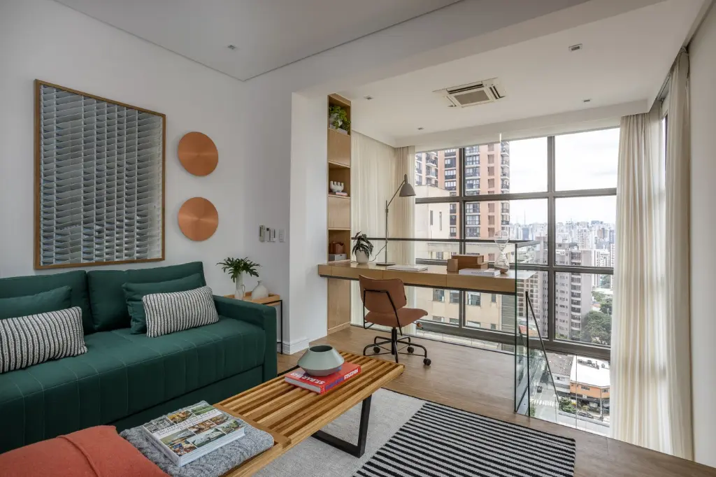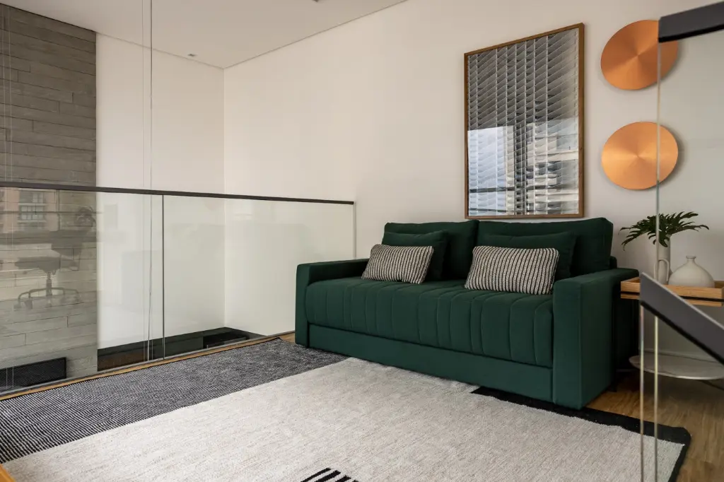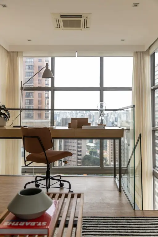 Mezanino em estrutura metálica com guarda-corpo em vidro abriga escritório e espaço de hóspedes, com piso vinílico Tarkett e mobiliário Fernando Jaeger.
