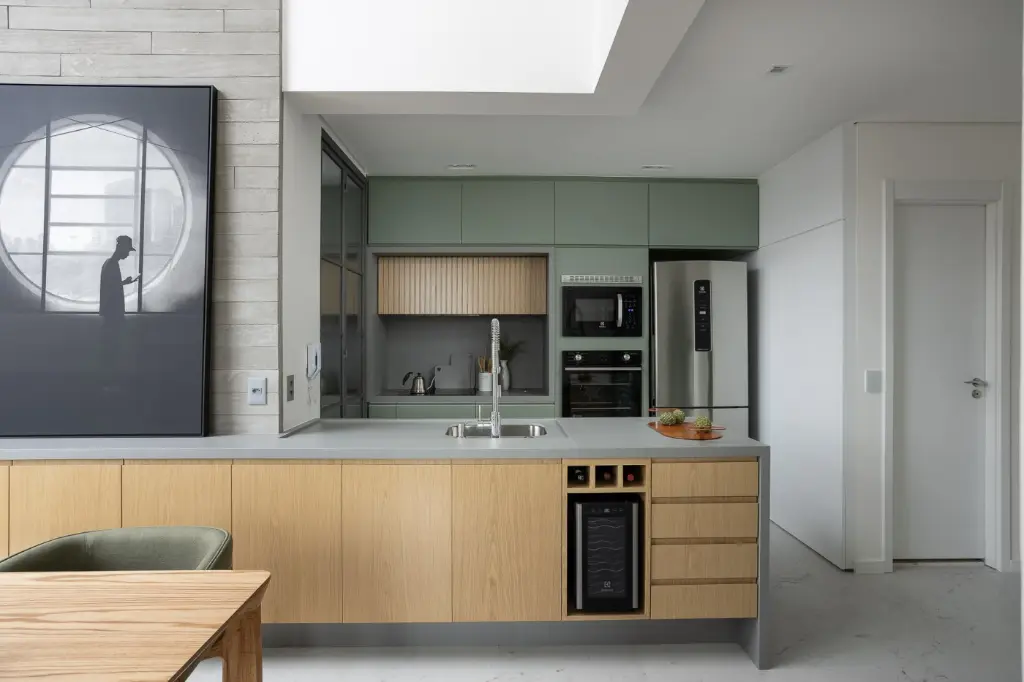 Cozinha planejada com superfícies Dekton Korus (Cosentino), marcenaria sob medida em fórmica e carvalho americano, torre quente com eletros embutidos, coifa oculta e península gourmet com triturador e módulo de barcafé e adega.