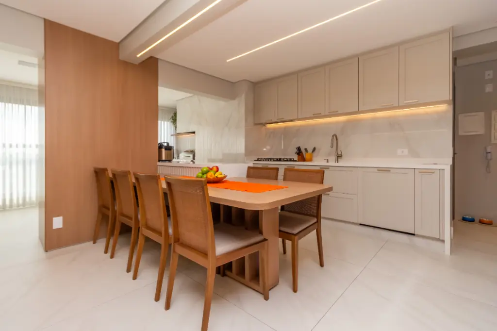 Cozinha planejada com eletrodomésticos embutidos Brastemp Gourmand e lava-louças Crissair.