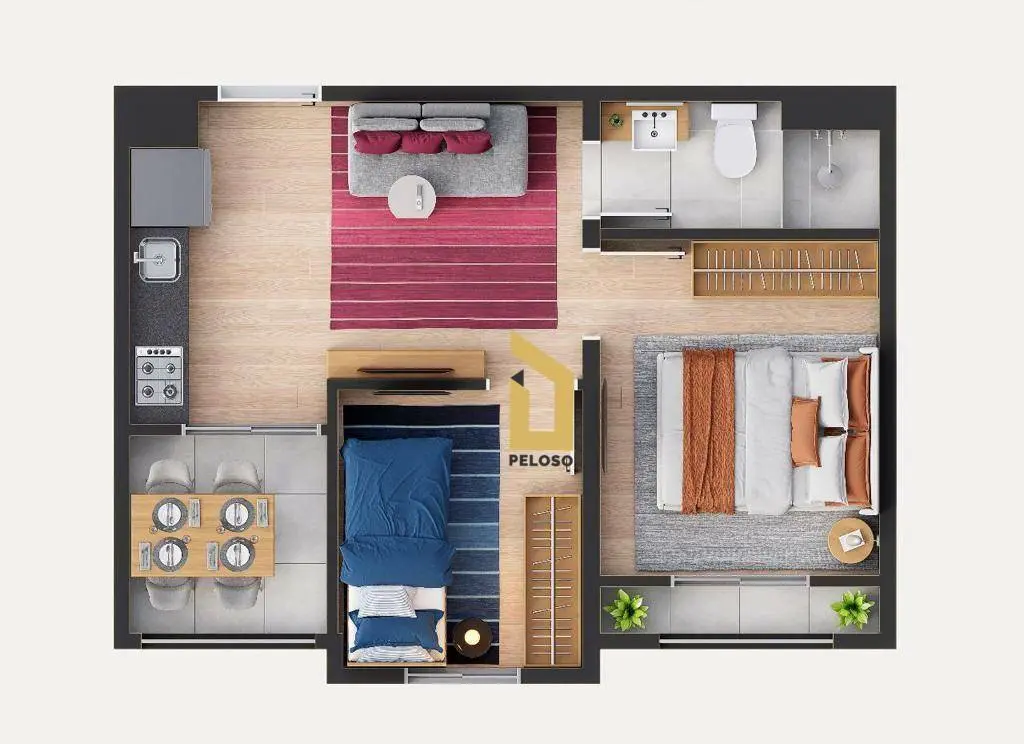 Com 37m² de área útil, com 2 dormitórios, sala, cozinha, banheiro e lavanderia.