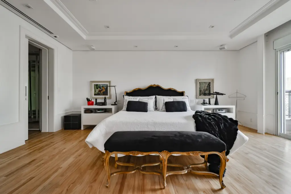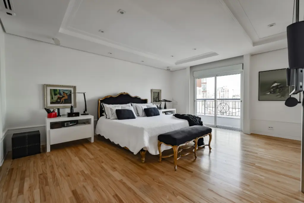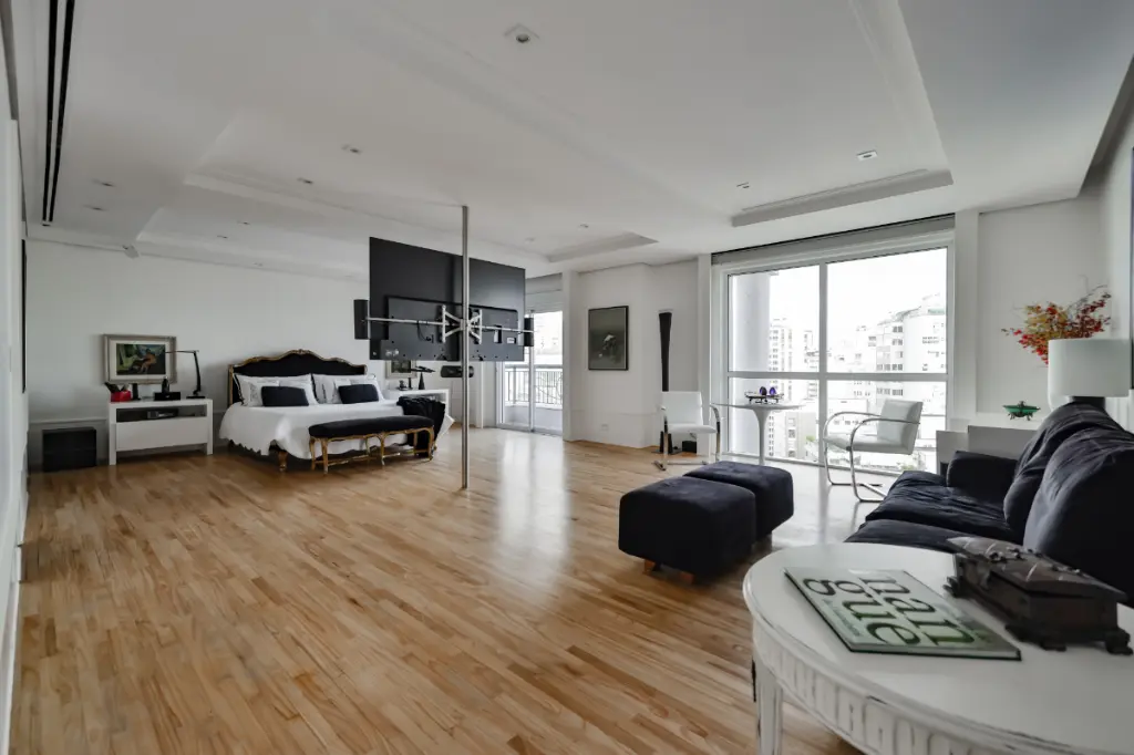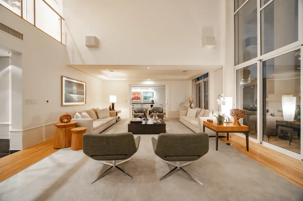 Localizado em andar alto, o imóvel oferece um living com pé-direito duplo, integrando amplos ambientes com iluminação natural abundante. A suíte master é um verdadeiro refúgio, com closets e banheiros Sr. e Sra, enquanto as demais suítes seguem o mesmo padrão de requinte e conforto.