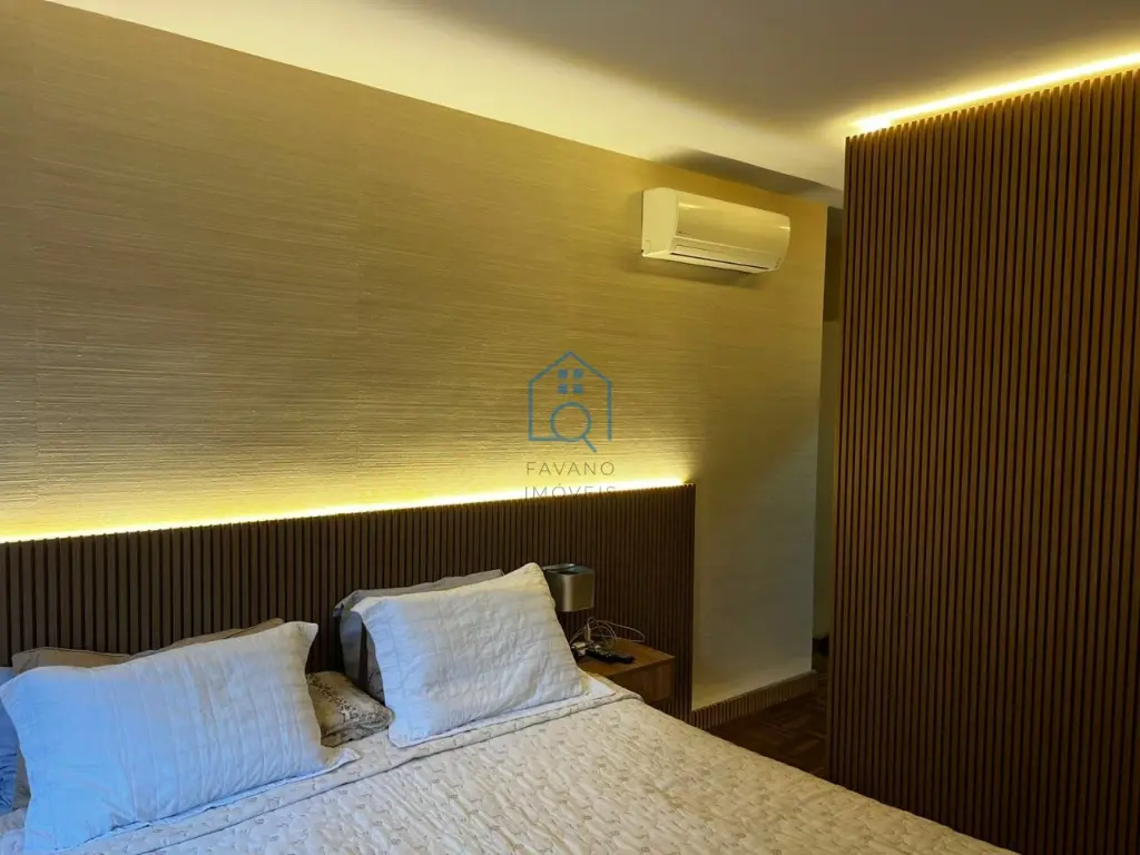 3 quartos, sendo 3 suítes com ar condicionado, e 7 banheiros no total.