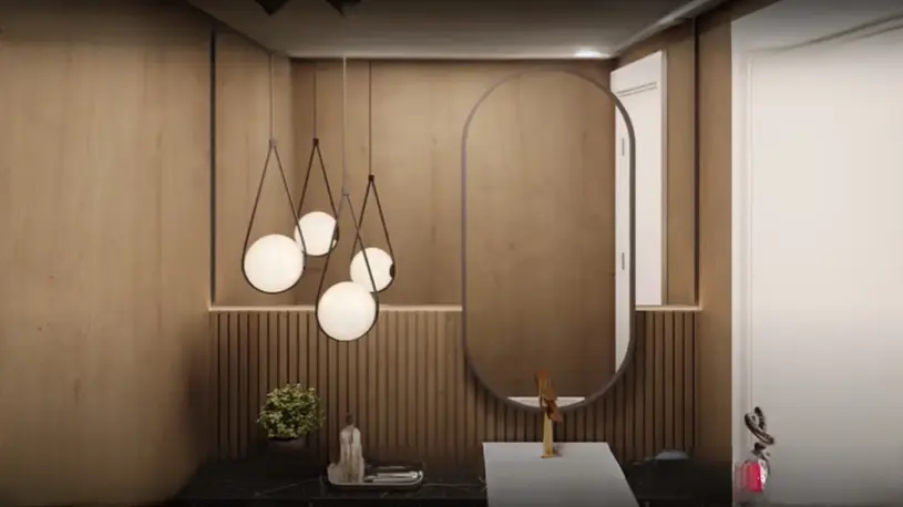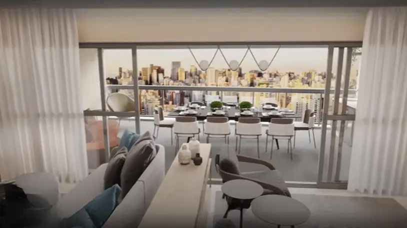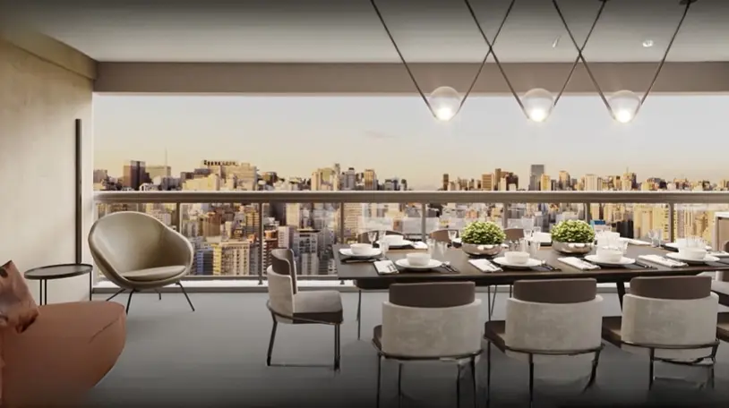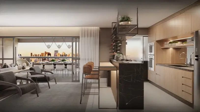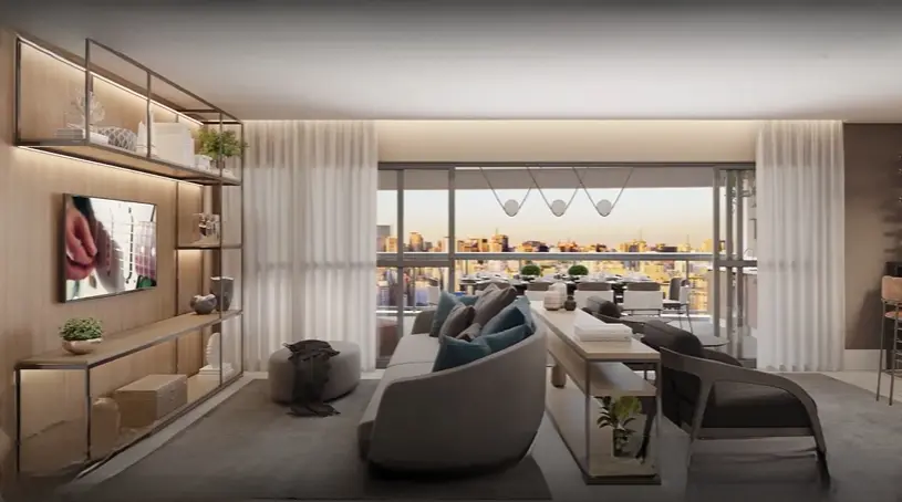 Este apartamento de alto padrão oferece 3 suítes, todas com acabamento refinado, sendo uma delas a suíte master com varanda privativa. No total são 5 banheiros (incluindo um lavabo), garantindo privacidade e conforto. A sala de estar é integrada com cozinha e varanda, proporcionando amplitude, luminosidade e excelente aproveitamento de espaço. Conta também com 3 vagas de garagem.