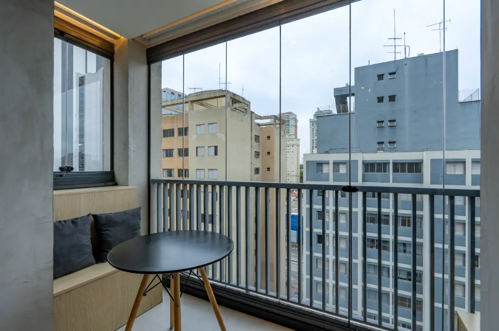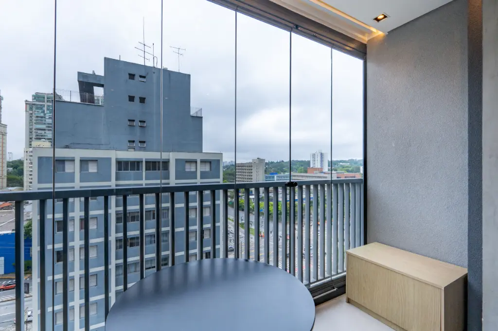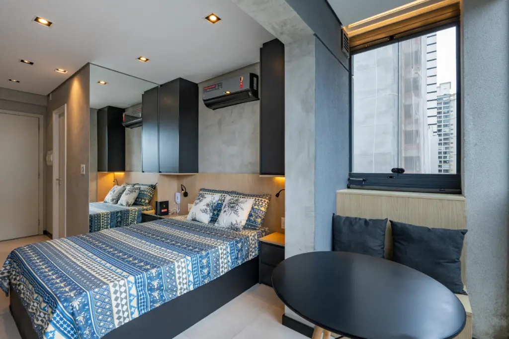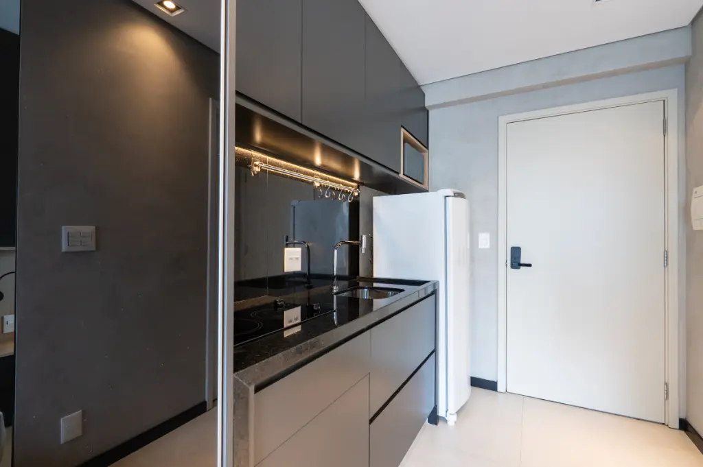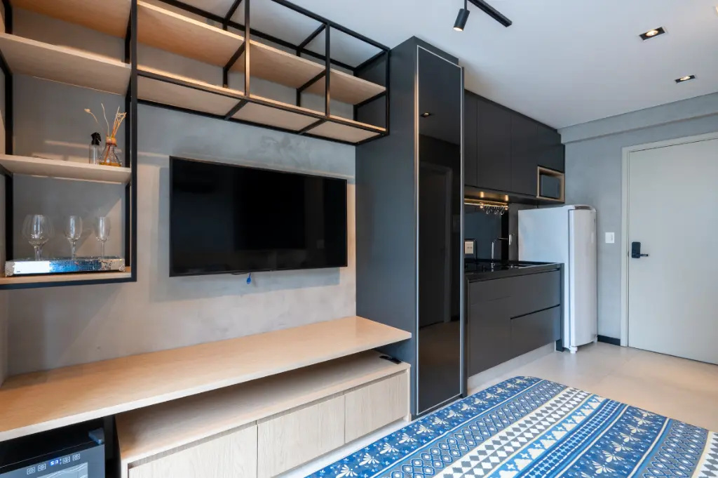 O ambiente é totalmente otimizado, com projeto inteligente de interiores que valoriza cada metro quadrado. O studio conta com armários planejados de excelente qualidade, ar-condicionado instalado, cozinha compacta e funcional, e acabamentos contemporâneos que transmitem elegância e bem-estar. A varanda possui fechamento em vidro e persianas automatizadas, ampliando o conforto e permitindo o melhor aproveitamento do espaço em qualquer momento do dia. A iluminação natural é outro destaque, criando um ambiente agradável e acolhedor ao longo do dia.