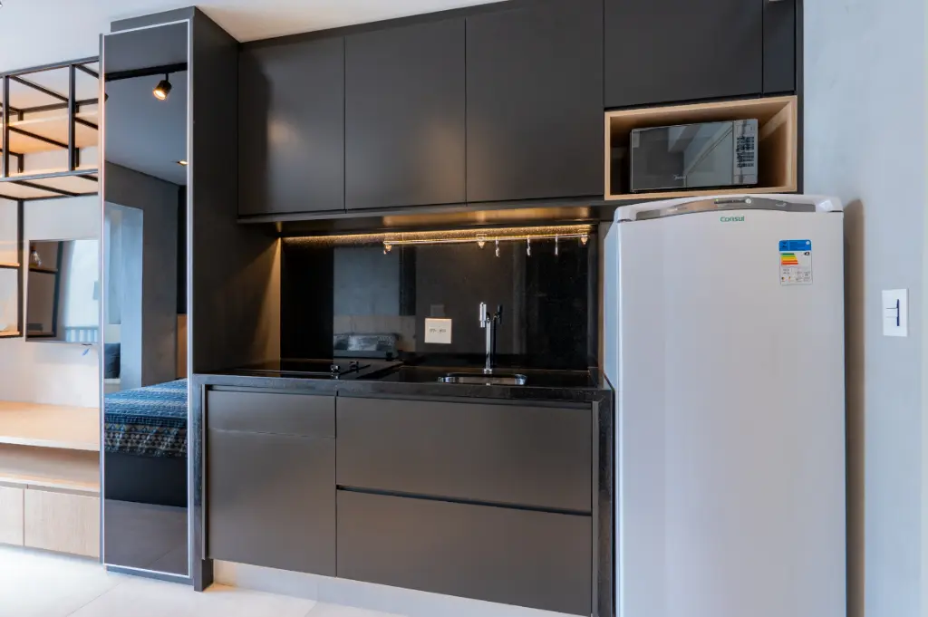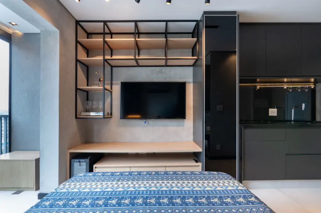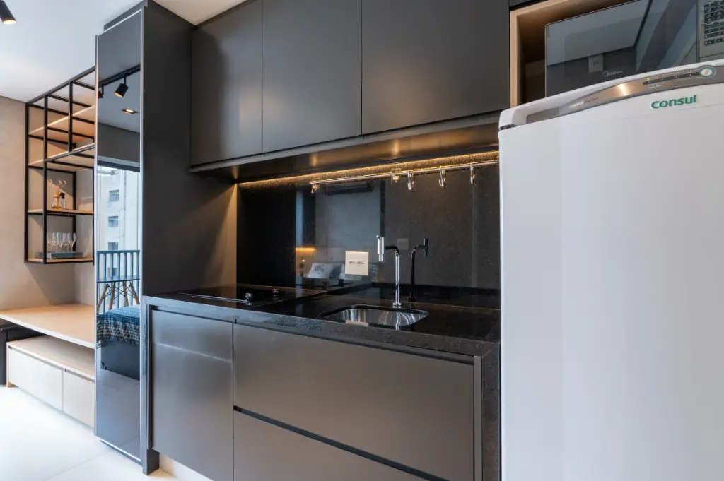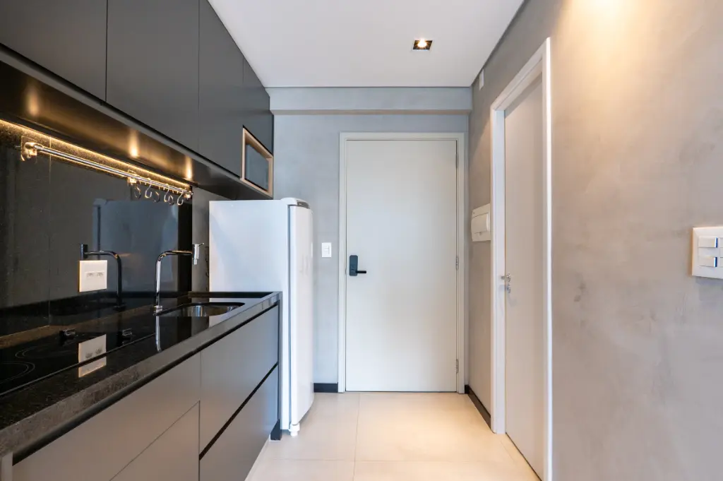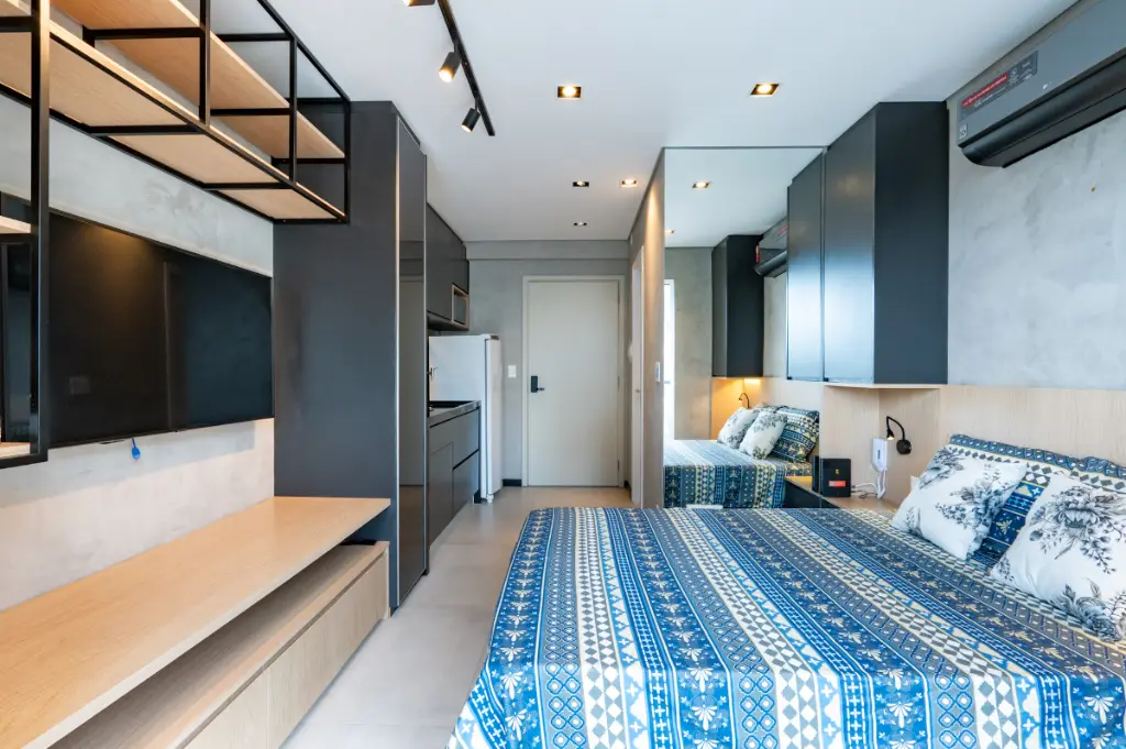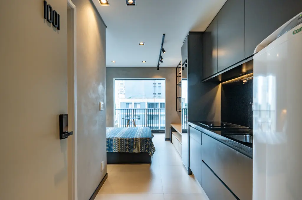 O ambiente é totalmente otimizado, com projeto inteligente de interiores que valoriza cada metro quadrado. O studio conta com armários planejados de excelente qualidade, ar-condicionado instalado, cozinha compacta e funcional, e acabamentos contemporâneos que transmitem elegância e bem-estar. A varanda possui fechamento em vidro e persianas automatizadas, ampliando o conforto e permitindo o melhor aproveitamento do espaço em qualquer momento do dia. A iluminação natural é outro destaque, criando um ambiente agradável e acolhedor ao longo do dia.