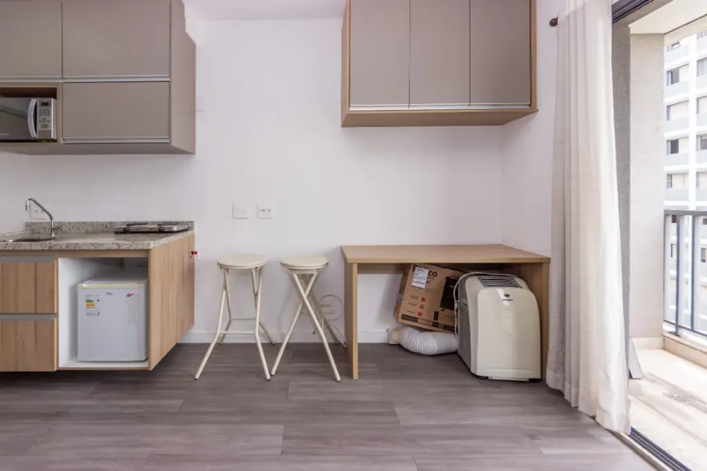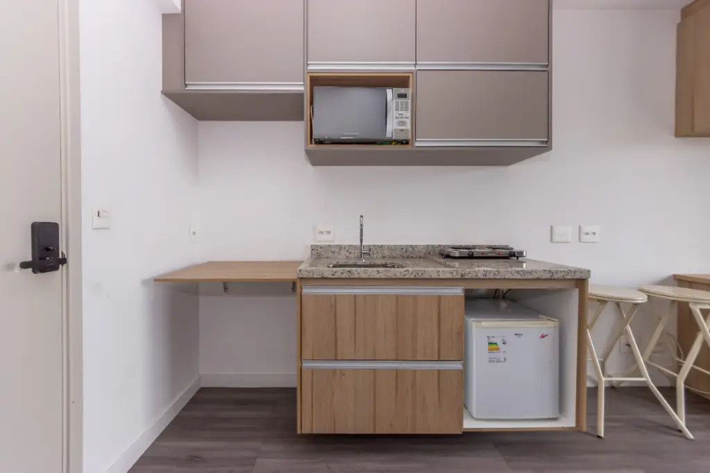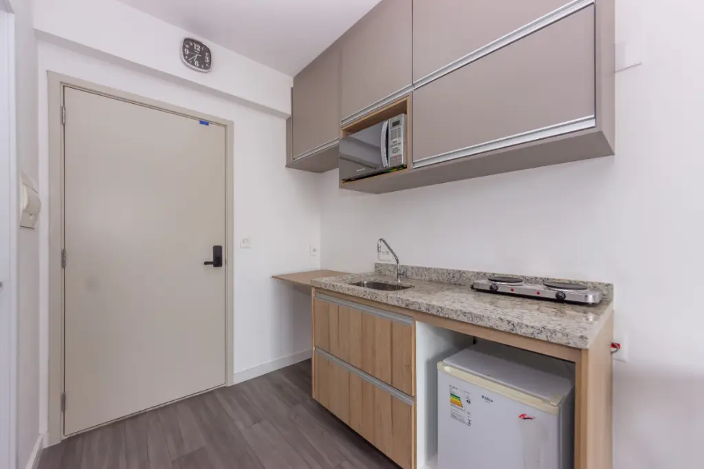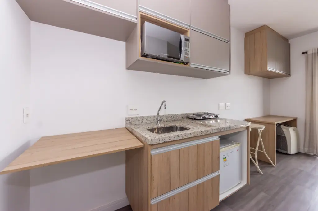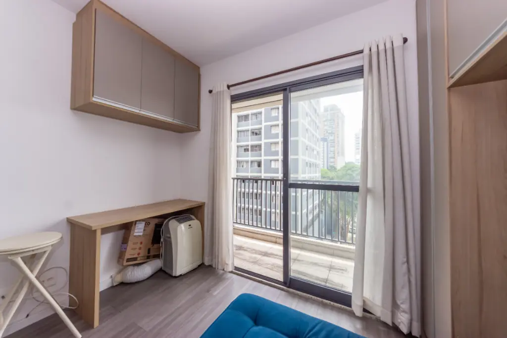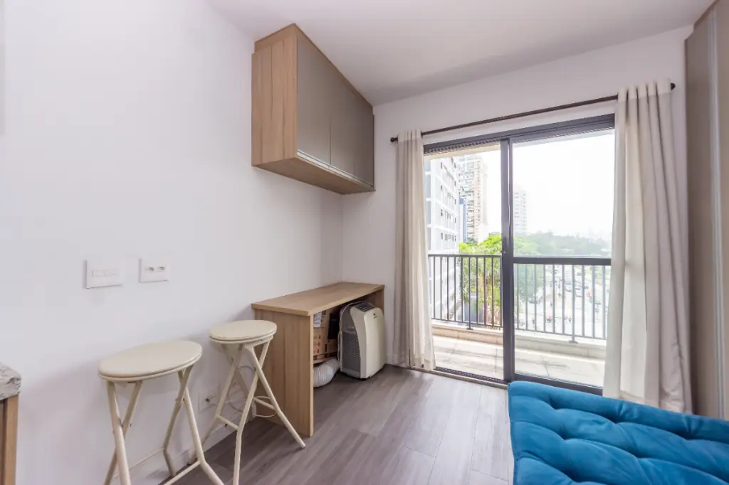 Este estúdio é a definição de ambientes integrados e vem equipado com armários embutidos, cozinha prática e uma varanda encantadora com vista aberta.