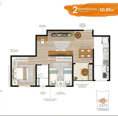 Unidade de 50m², 2 dormitórios, varanda e 2 vagas de carro, R$ 390 mil reais