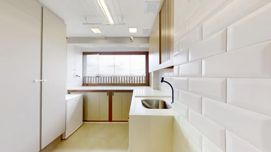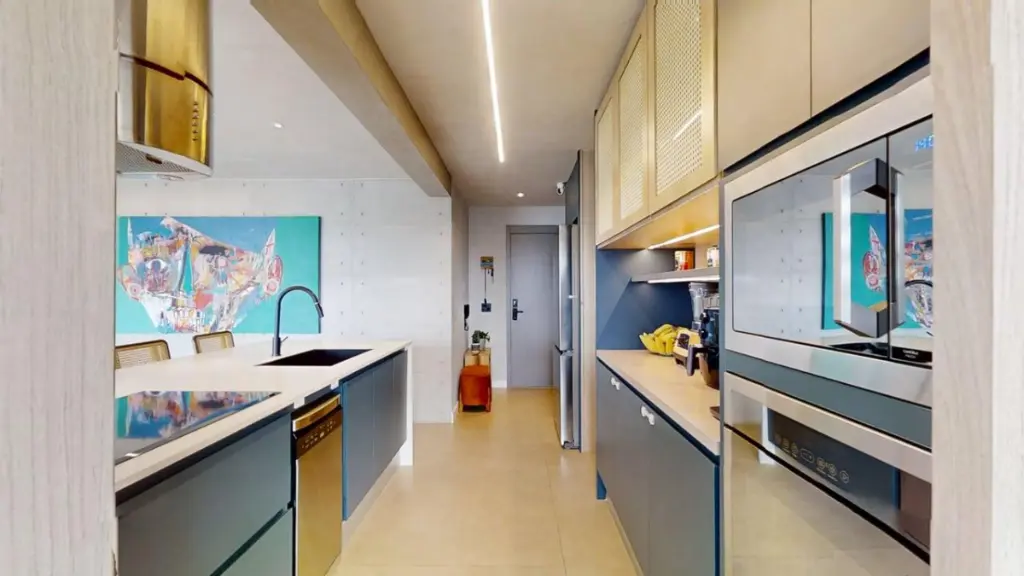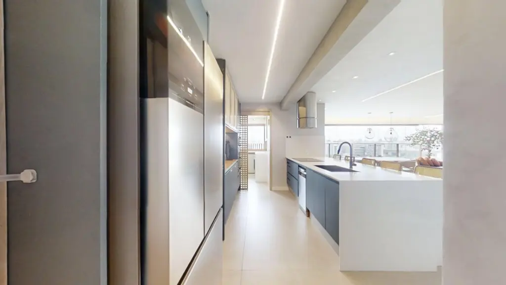O amplo living integra a sacada com churrasqueira e a cozinha, criando um ambiente perfeito para receber e aproveitar momentos especiais com vista livre e definitiva para Moema - um verdadeiro refúgio urbano.