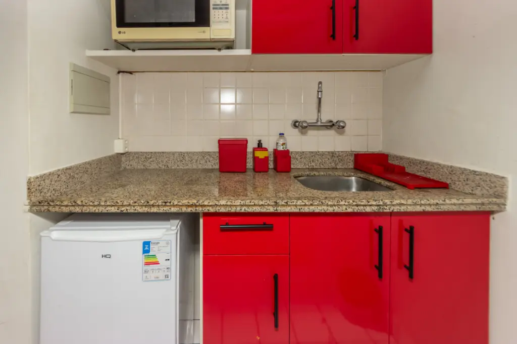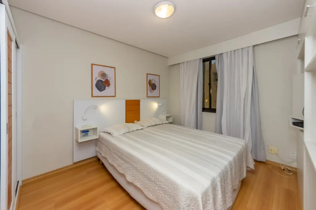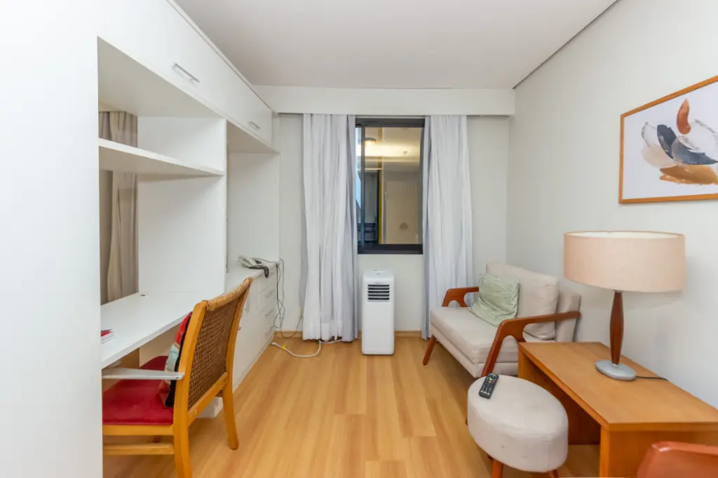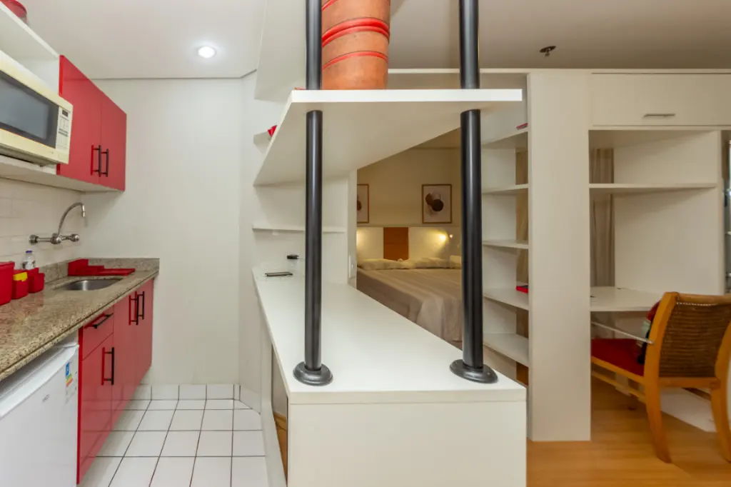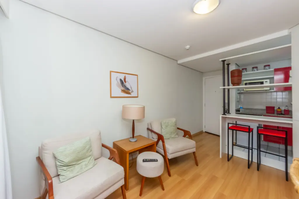 O apartamento conta com um quarto bem iluminado, um banheiro e uma cozinha integrada, proporcionando um espaço moderno e funcional. Os móveis planejados otimizam a área, garantindo organização e estilo. Além disso, dispõe de água quente, gás encanado e interfone para sua comodidade.