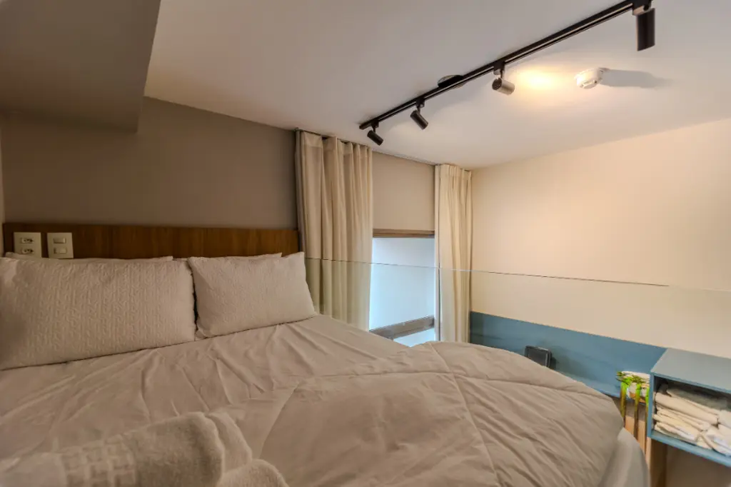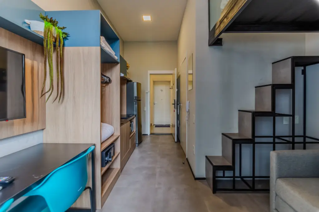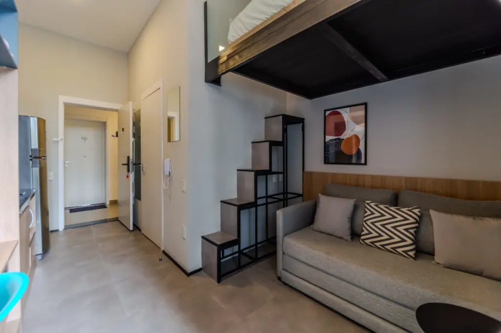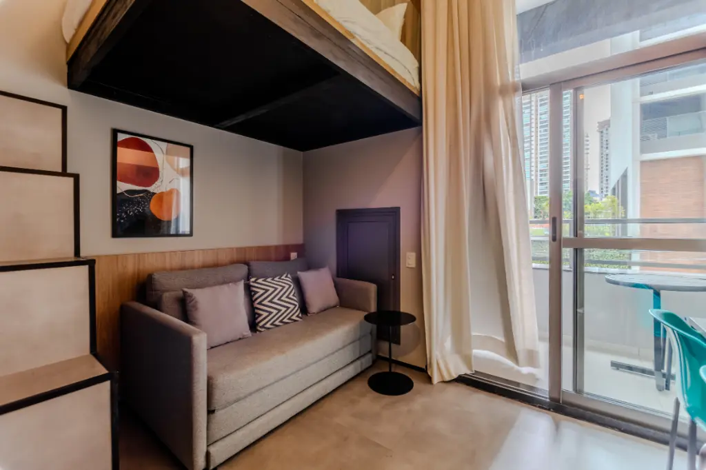 Com 36 m² de área total, este studio reúne design contemporâneo, pé-direito elevado e mezanino funcional, criando uma atmosfera moderna e altamente desejada no mercado atual.