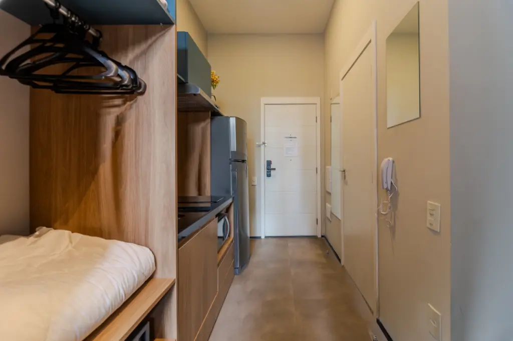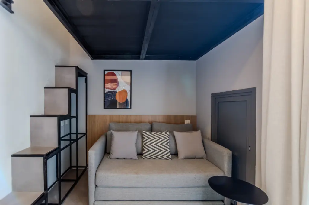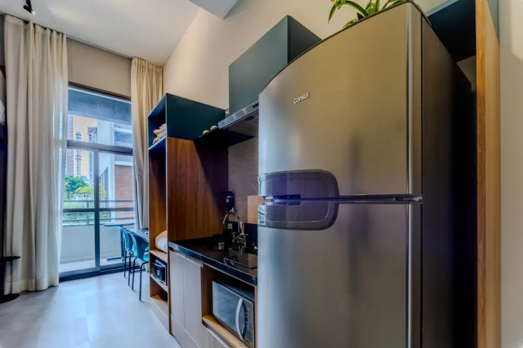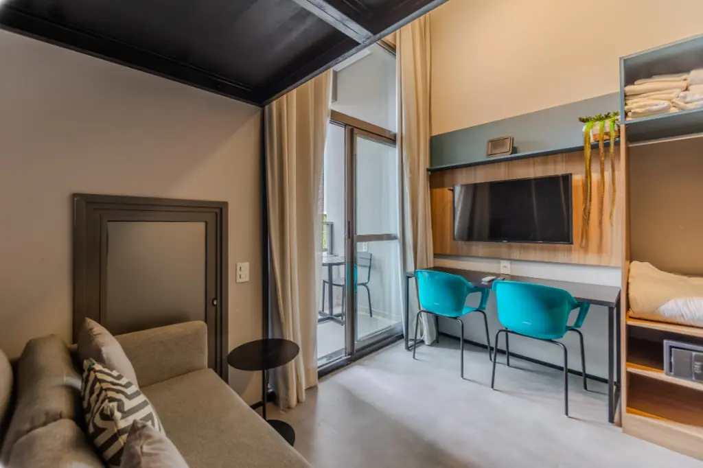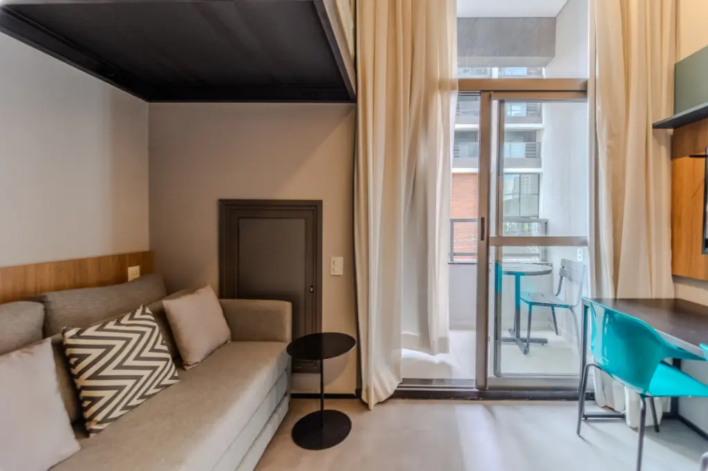 Com 36 m² de área total, este studio reúne design contemporâneo, pé-direito elevado e mezanino funcional, criando uma atmosfera moderna e altamente desejada no mercado atual.