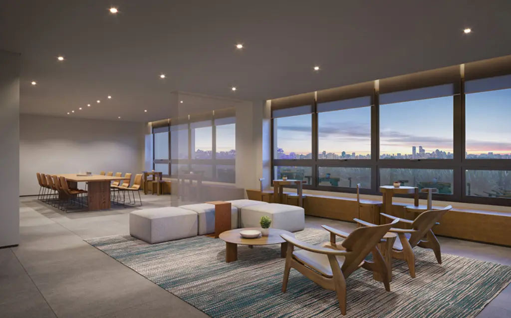 Rooftop com vista panorâmica, coworking, salão de festas e lounge bar/restaurante