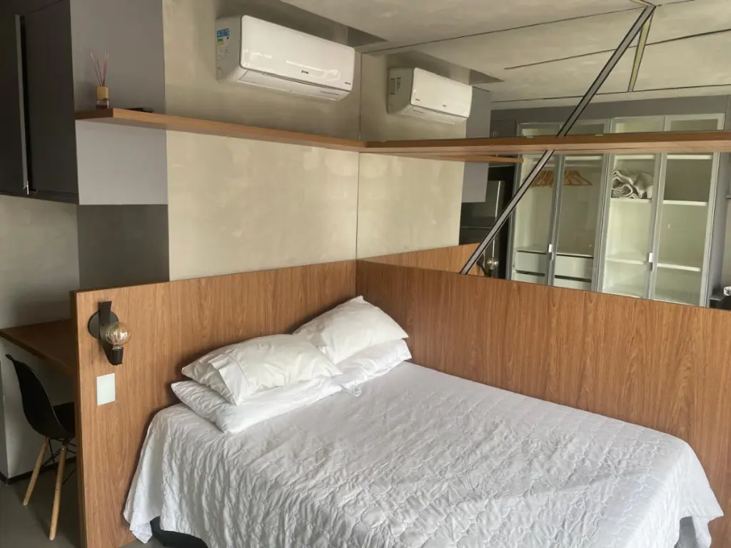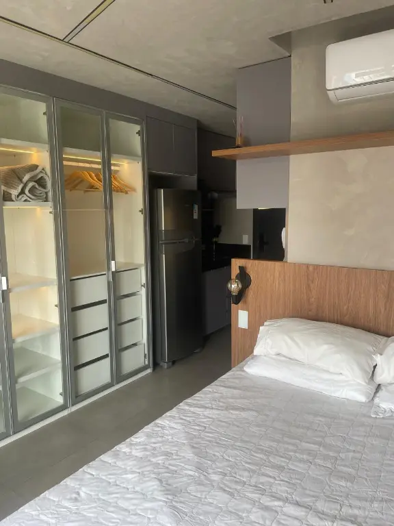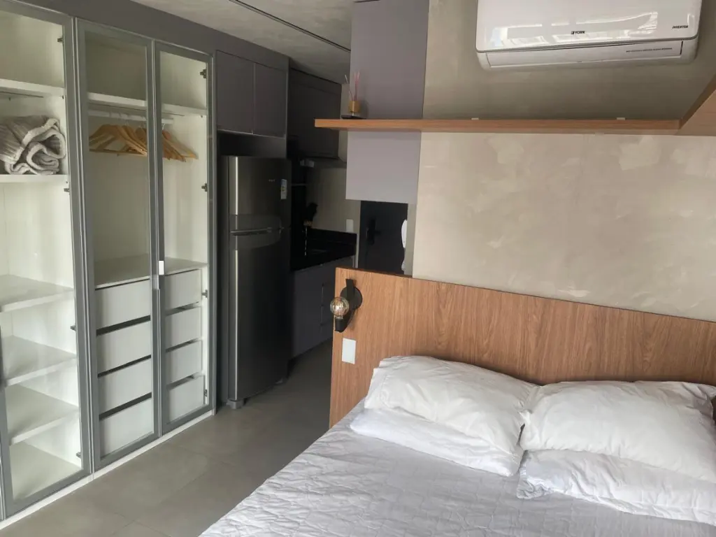 O espaço dispõe ainda de cama confortável, sofá, painel com TV, ar-condicionado e acabamentos sofisticados que valorizam cada detalhe. Ideal para quem busca praticidade sem abrir mão de elegância.
