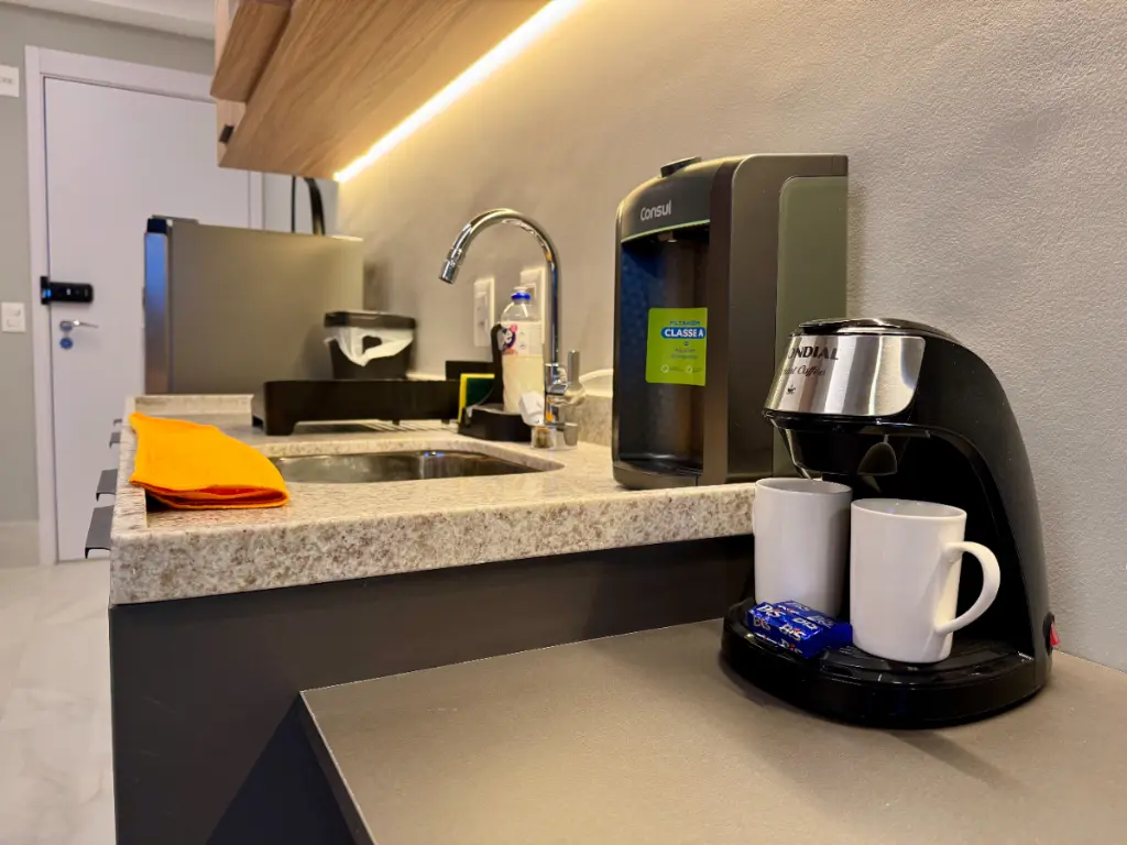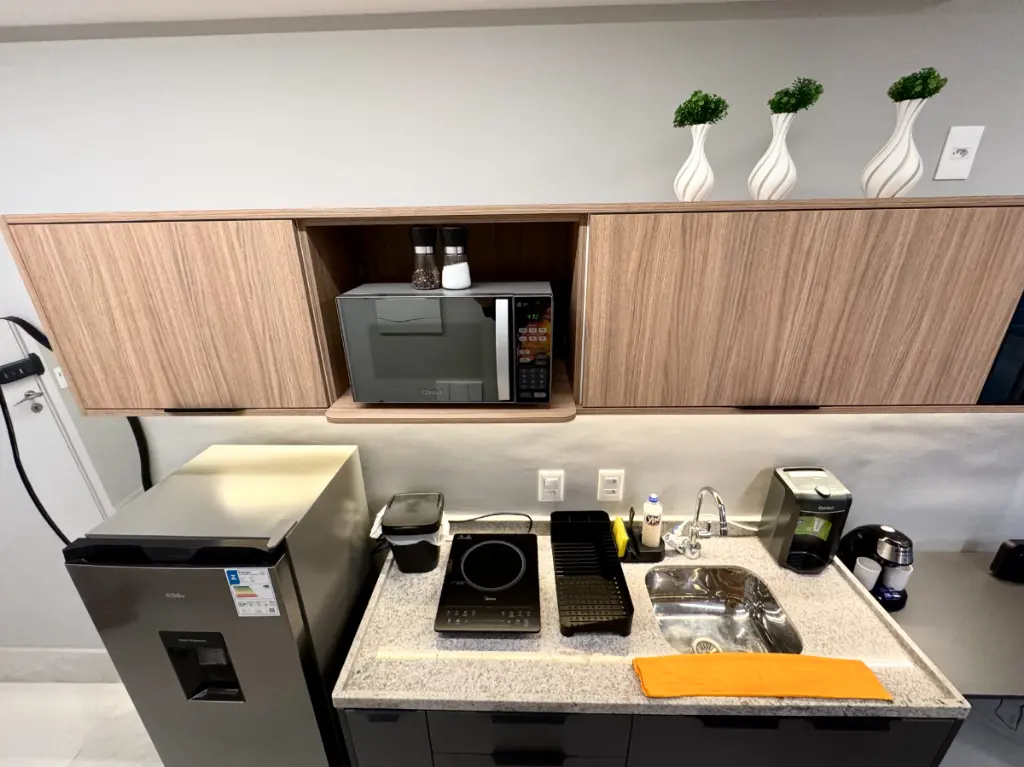 - Cozinha equipada: Geladeira, Microondas, Cooktop, Air Fryer, Cafeteira e Utensílios gerais (Louças, panelas, talheres, potes)