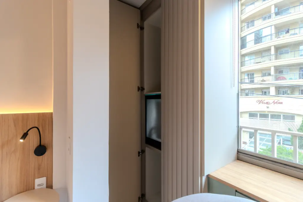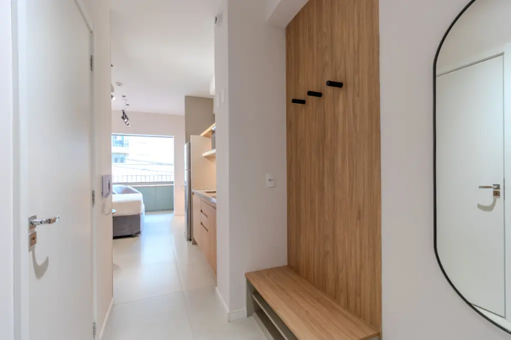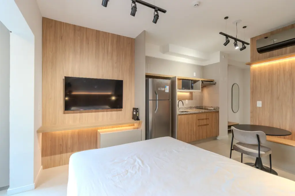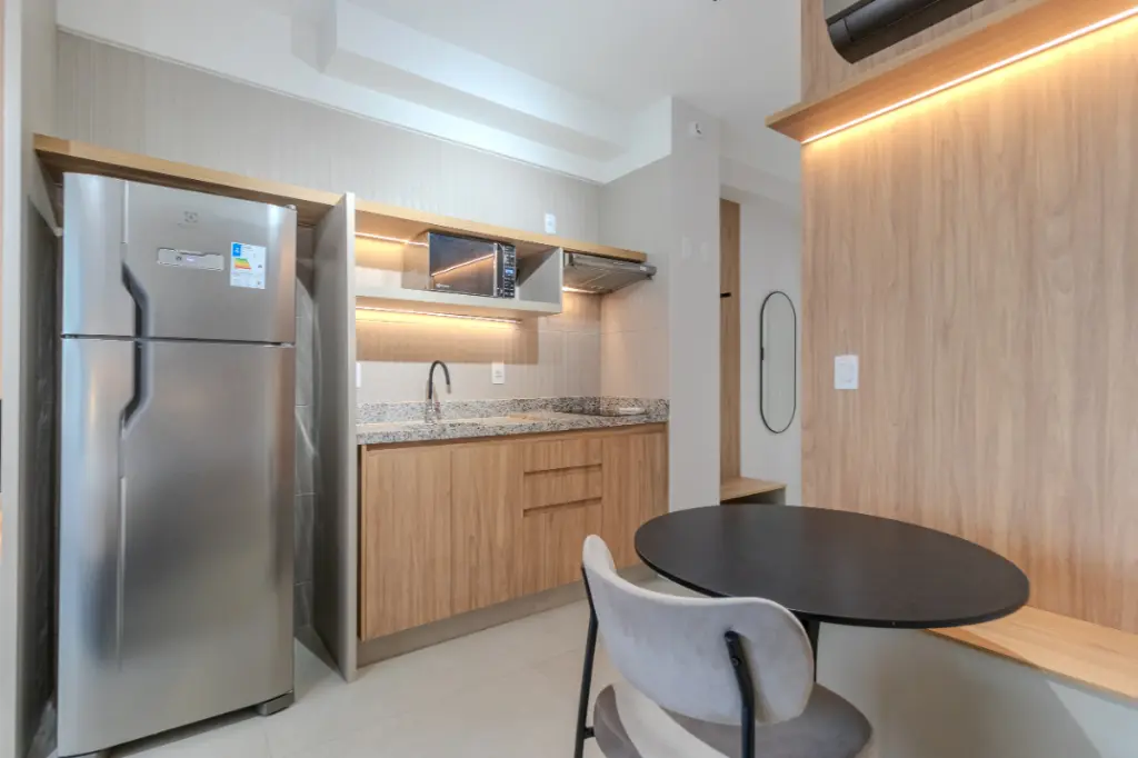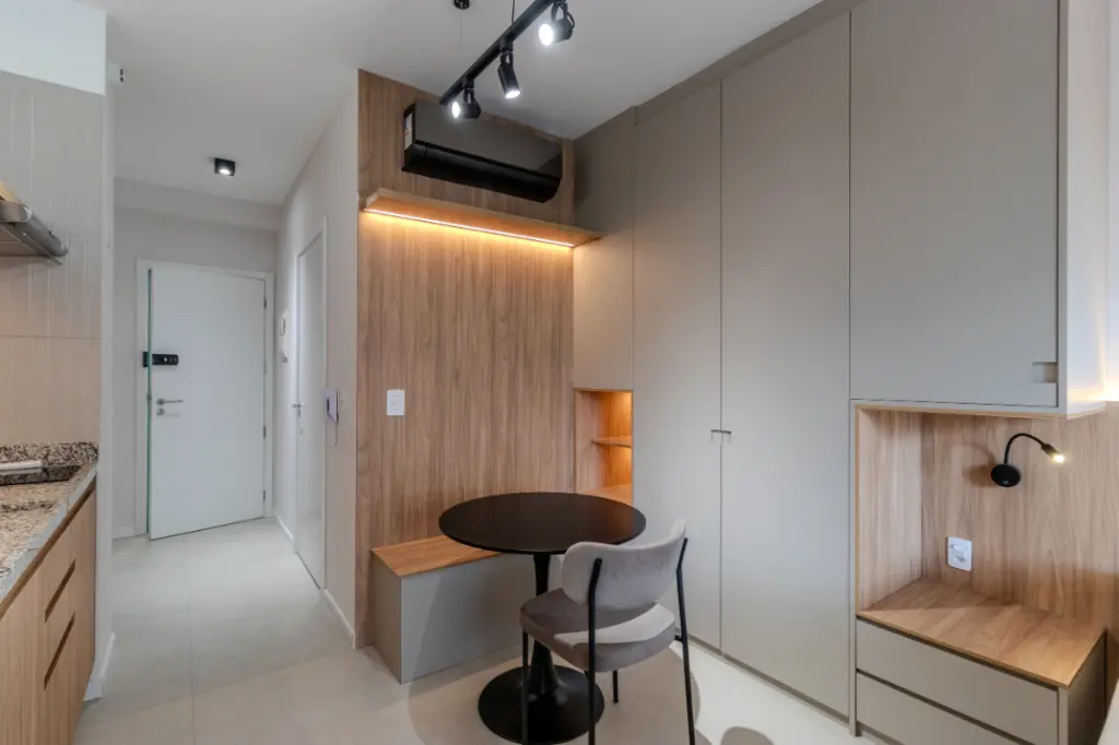 Com 30m2 inteligentemente distribuídos, o studio apresenta projeto contemporâneo, marcenaria planejada de excelente qualidade e eletrodomésticos instalados, compondo um ambiente elegante, funcional e acolhedor.
