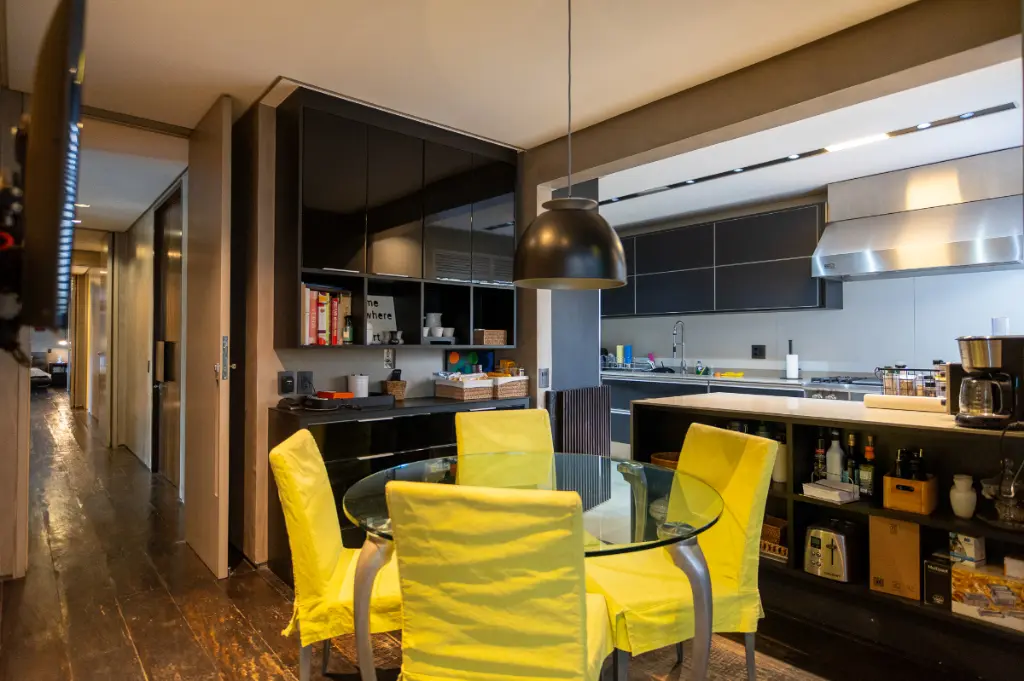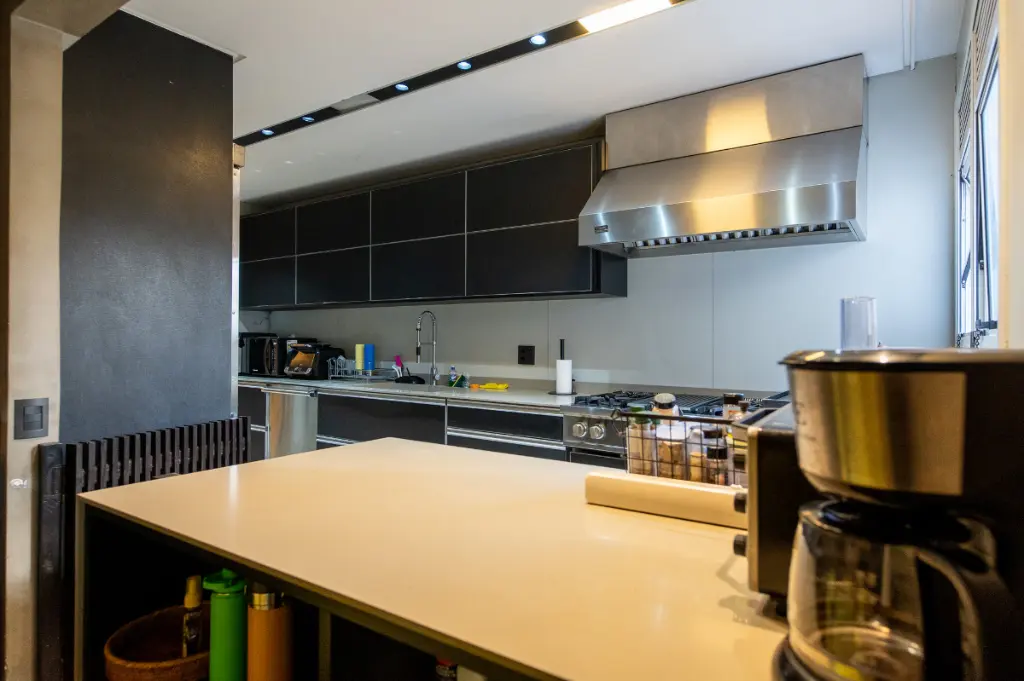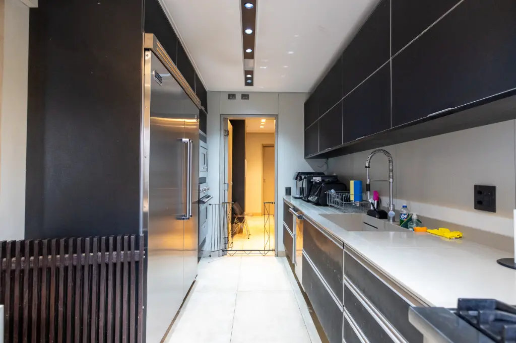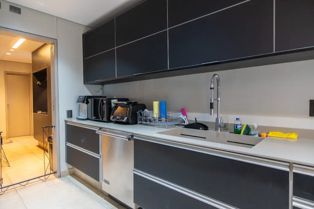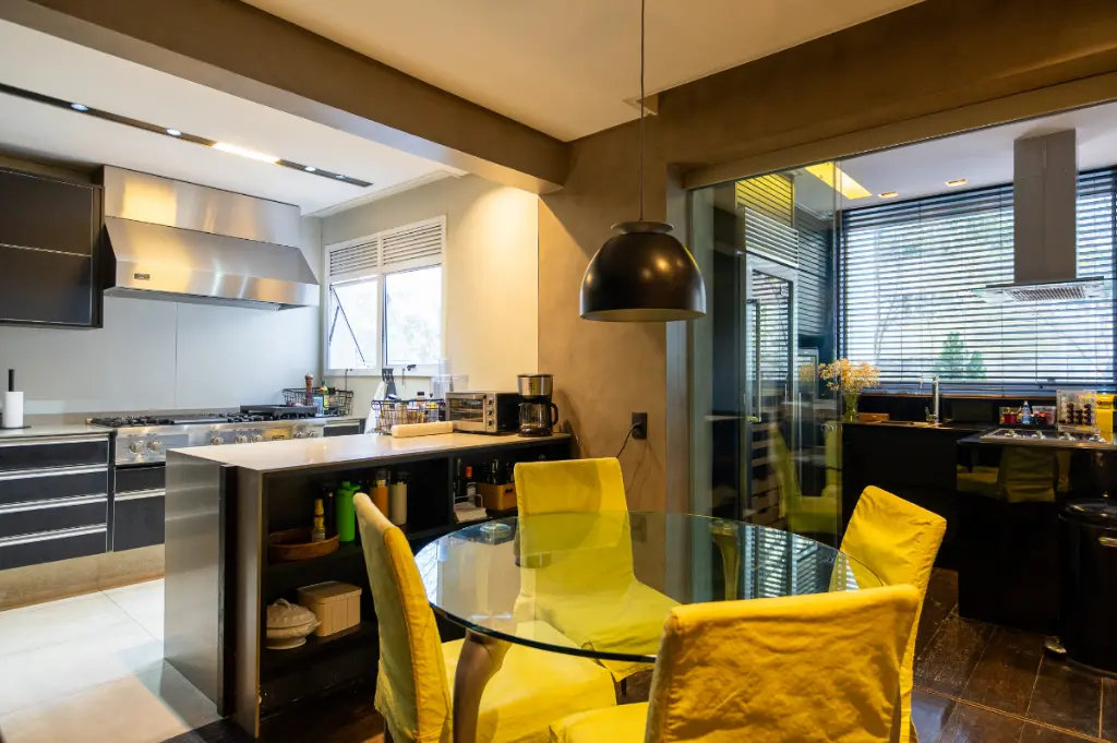 A área social foi pensada para momentos únicos: uma ampla sala para dois ambientes totalmente integrada à varanda, perfeita para receber convidados com charme e conforto. A varanda generosa amplia a sensação de espaço e iluminação natural, criando uma atmosfera acolhedora e sofisticada. A cozinha, espaçosa e bem iluminada, possui copa e oferece praticidade tanto no dia a dia quanto em ocasiões especiais, além de contar com área de serviço independente e dependência para colaboradores.