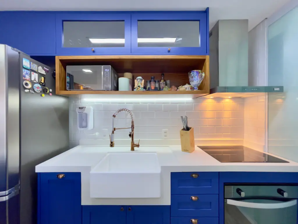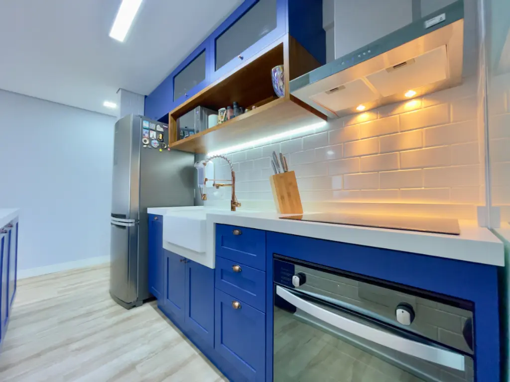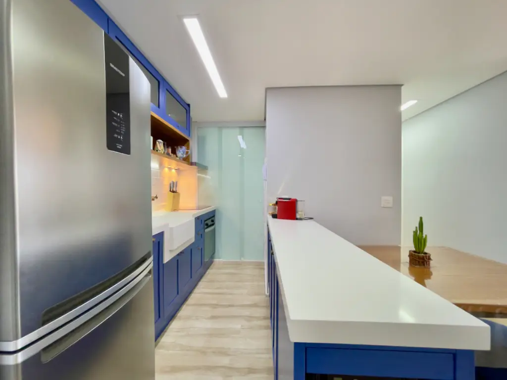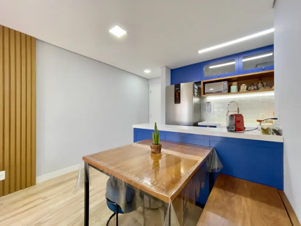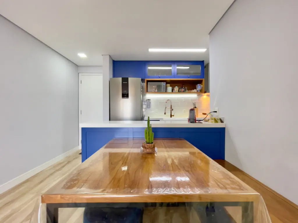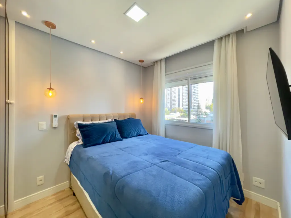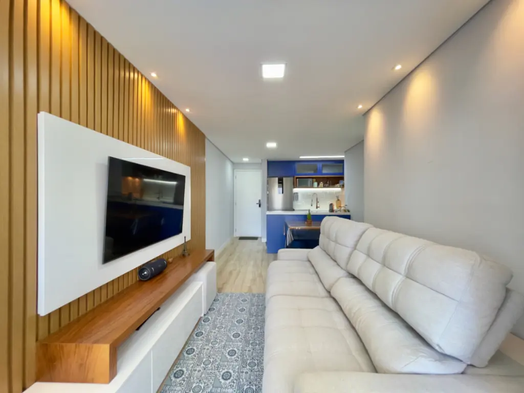 Os acabamentos do imóvel também se destacam: o piso vinílico Tarkett nos ambientes secos oferece conforto térmico e acústico, enquanto os revestimentos Portobello nos ambientes molhados garantem modernidade e resistência. O quarto do casal conta ainda com ar-condicionado inverter da Fujitsu, ideal para manter a temperatura perfeita em todas as estações. Outro diferencial é o projeto de iluminação versátil, que combina luzes quentes e frias, possibilitando criar diferentes atmosferas conforme a ocasião.