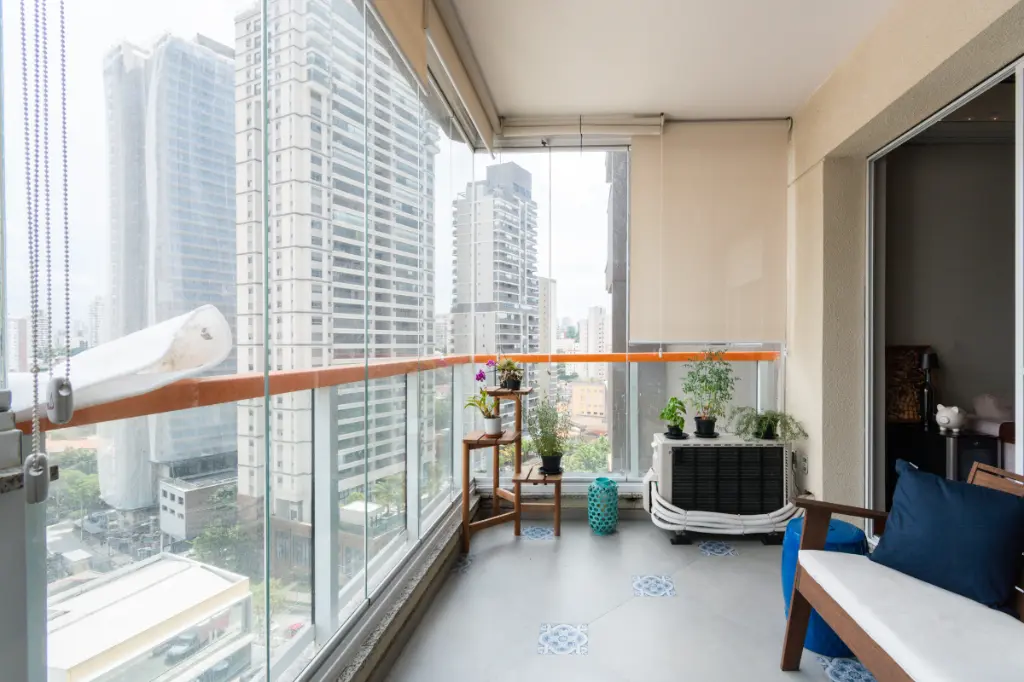 Varanda gourmet equipada e fechada com vidro.