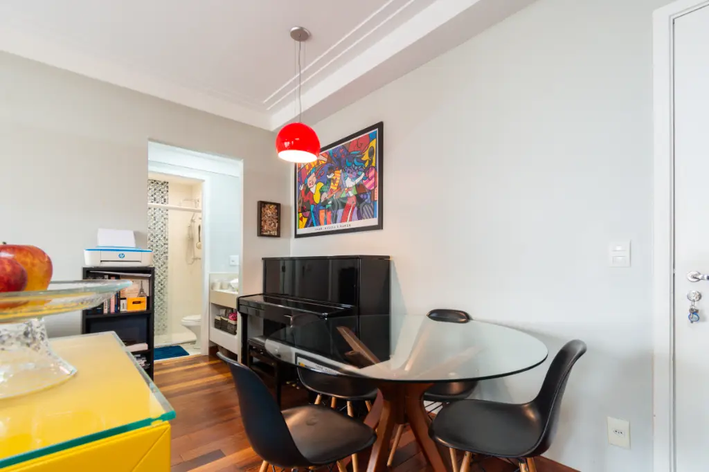 Sala com sofá, tapete, mesa redonda de vidro com 4 cadeiras e TV LED. Suíte com cama box + colchão de molas ensacadas, armários planejados e TV LED Ar-condicionado na sala e na suíte. Banheiro moderno com revestimento de qualidade.